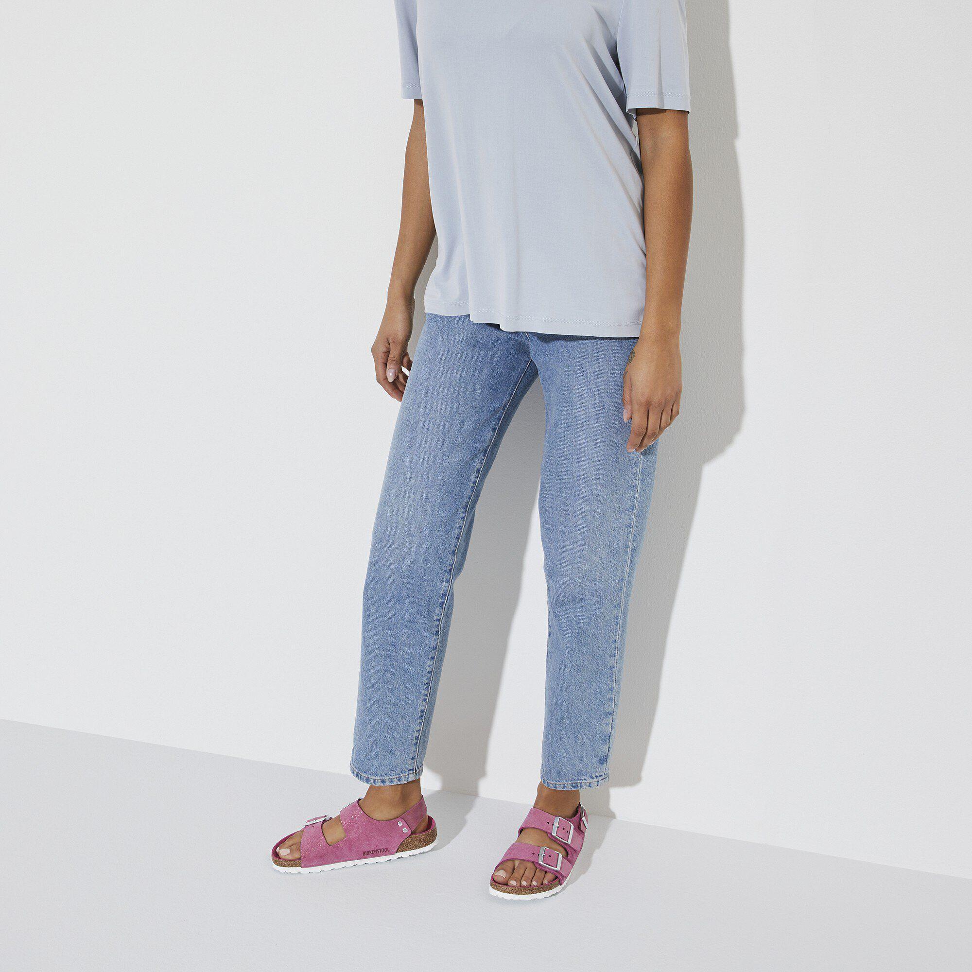 The spotlight's on Milano. Shimmery suede catches the sun from every angle of this street-inspired sandal. An adjustable backstrap gives you added security and a fit that's just right. Complete with an original BIRKENSTOCK cork-latex footbed that shapes to you for custom support.