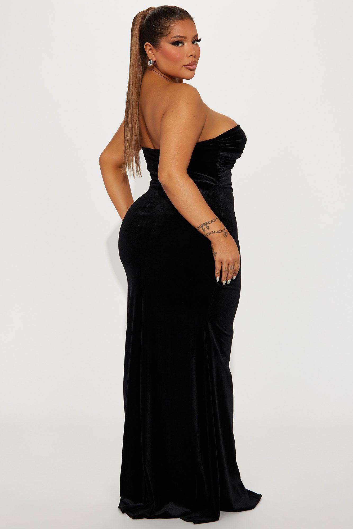 Available In Black. Velvet Maxi Dress Strapless Sweetheart Neckline Knot Twist Front High Front Slit Stretch Self: 95% Polyester 5% Spandex Lining: 100% Polyester Imported California Proposition 65WARNING: Cancer and Reproductive Harm - www.P65Warnings.ca.gov.