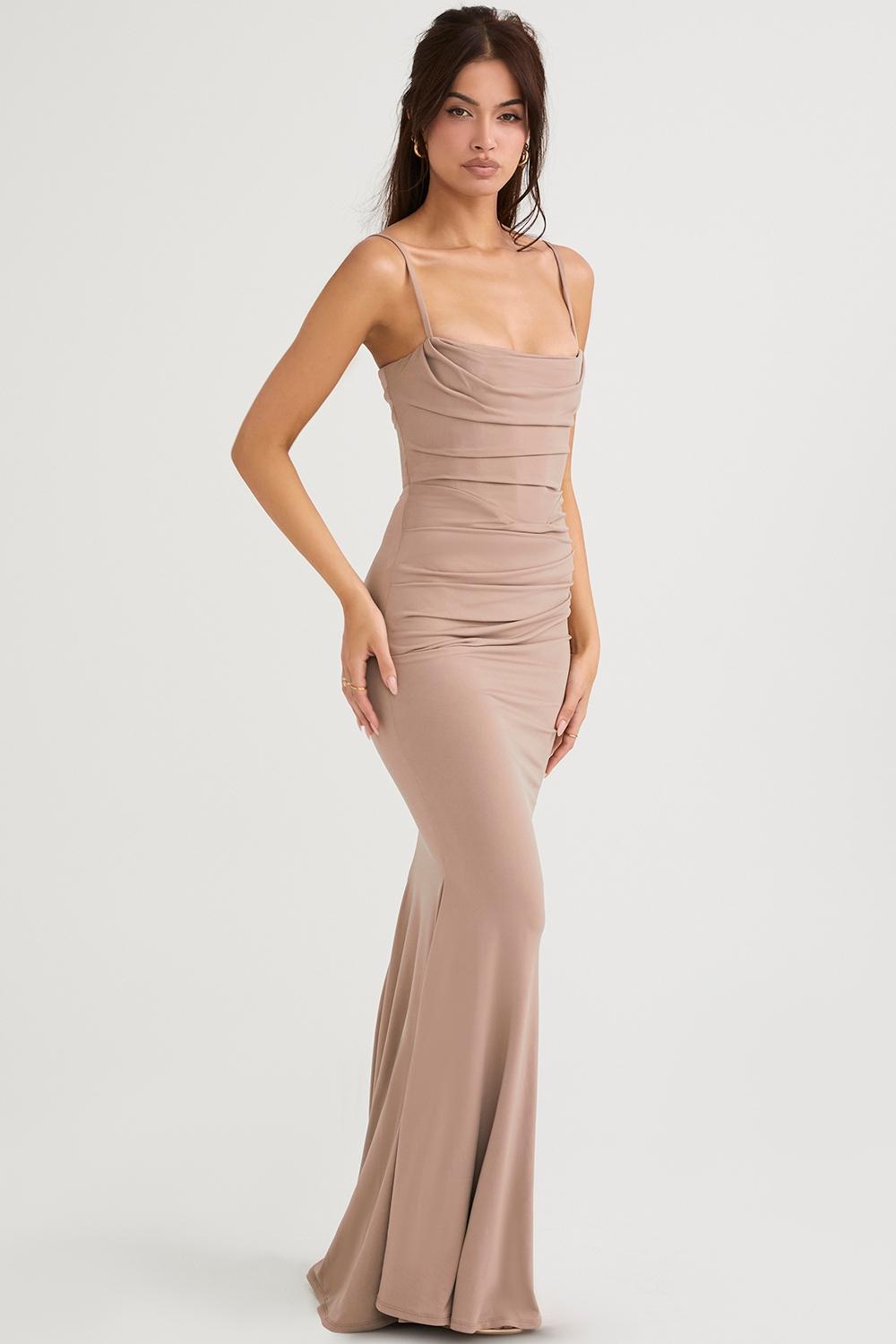 Simply elegant, 'Milena' is the dress of all dresses and oozes effortless glamour. Cut from our weighted stretch jersey that is super comfy to wear, 'Milena' features a beautifully draped bodice with delicate rouleau shoulder straps and is fully corseted for an ultra cinched fit that uplifts the bust for incredible cleavage.