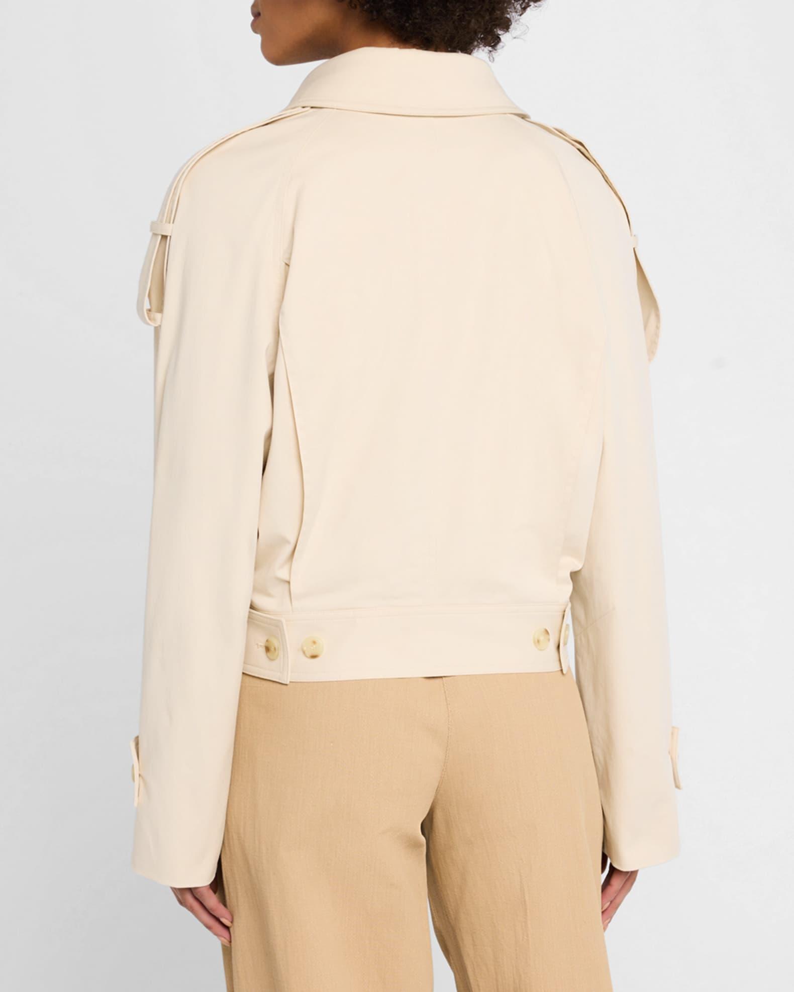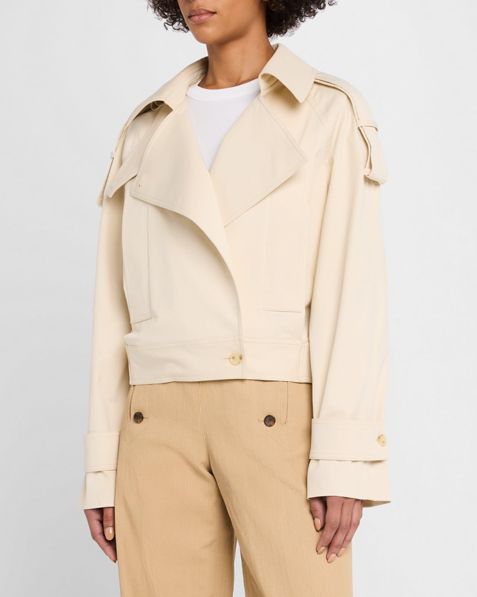 A.L.C. "Miles" utility jacket with exaggerated details Notched lapel; asymmetric button front Shoulder epaulettes Long raglan sleeves Button tab cuffs Side slip pockets Buttoned hem tabs Oversized fit Cotton/elastane Lining: Cotton/polyester Dry clean Imported