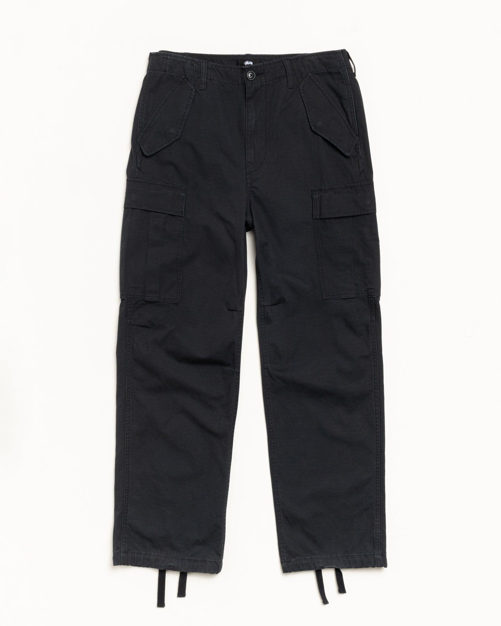 Relaxed fit cargo pant in stonewashed cotton ripstop. Features pocket detailing with concealed snaps, and adjustable waistband and cuffs. Stüssy stock flag label at rear pocket. - Zip fly and button closure - Side flap pockets - Rear flap pockets - Two large cargo pockets - Interior coin pocket - Relaxed fit - Unisex - Material: 100% cotton - Imported
