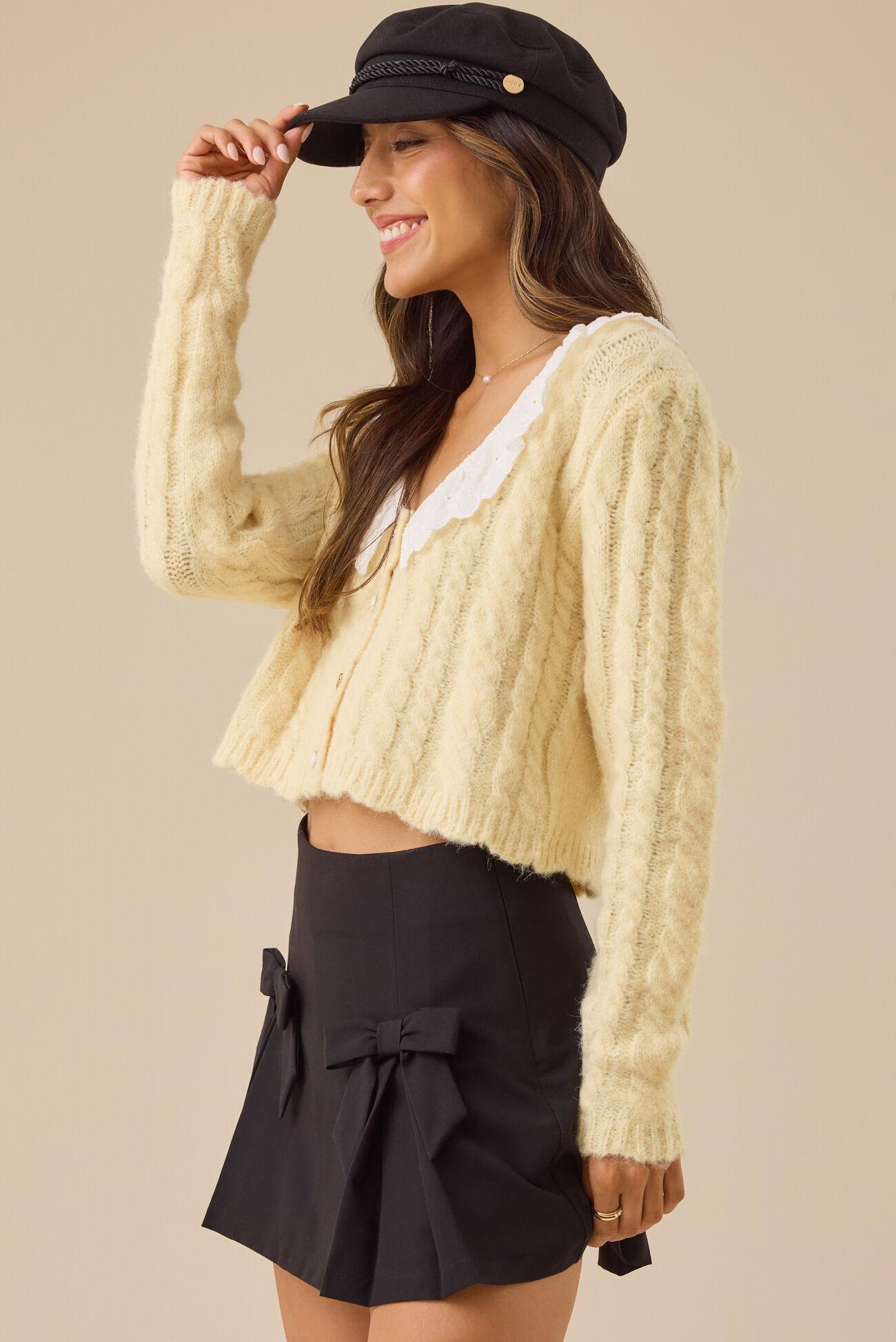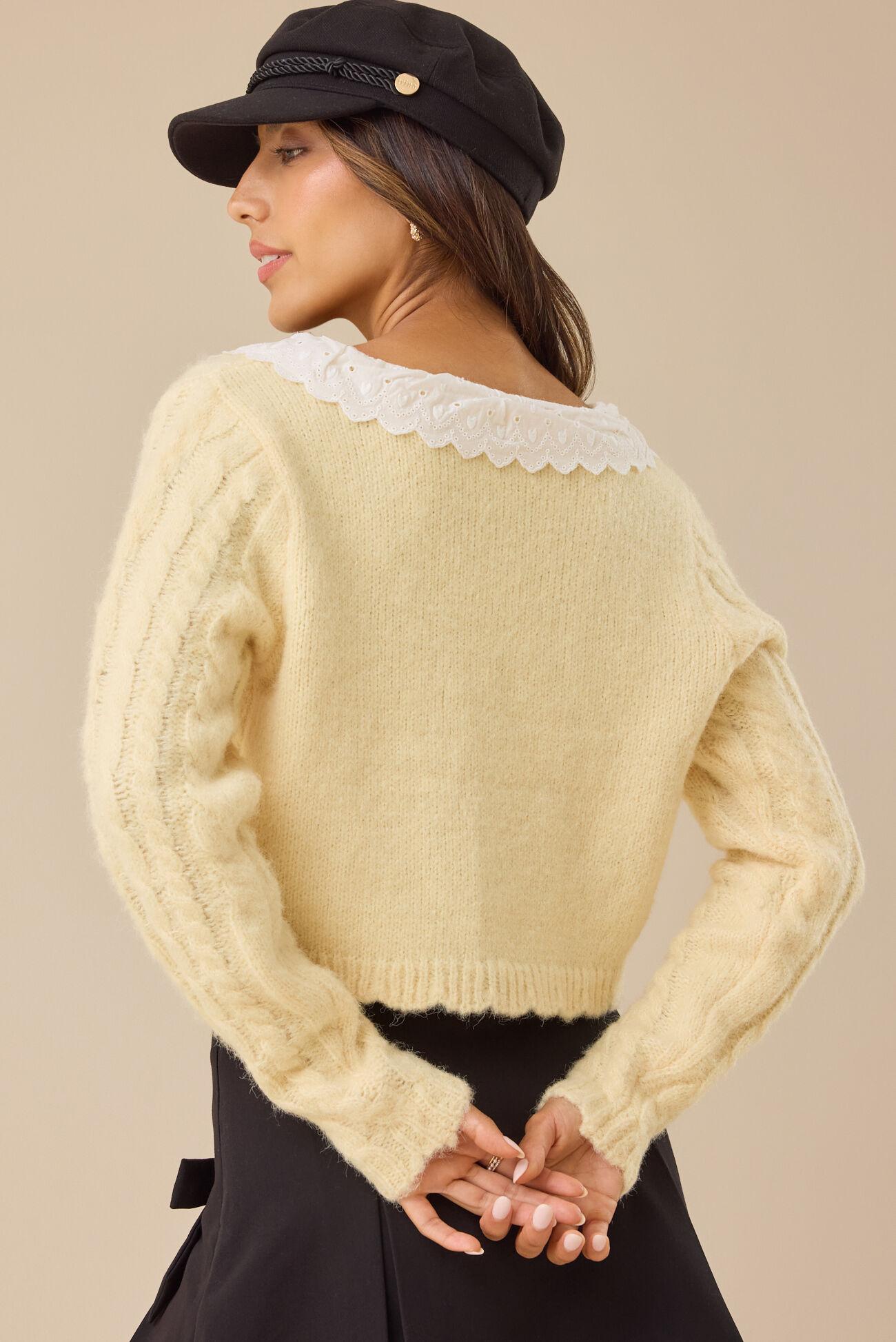 This button-down cardigan sweater features a delicate lace Peter Pan collar and adorable heart buttons. It's the perfect sweet touch for any outfit.
