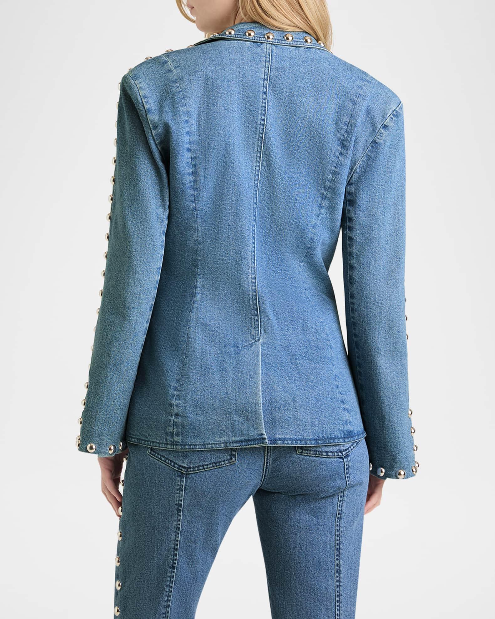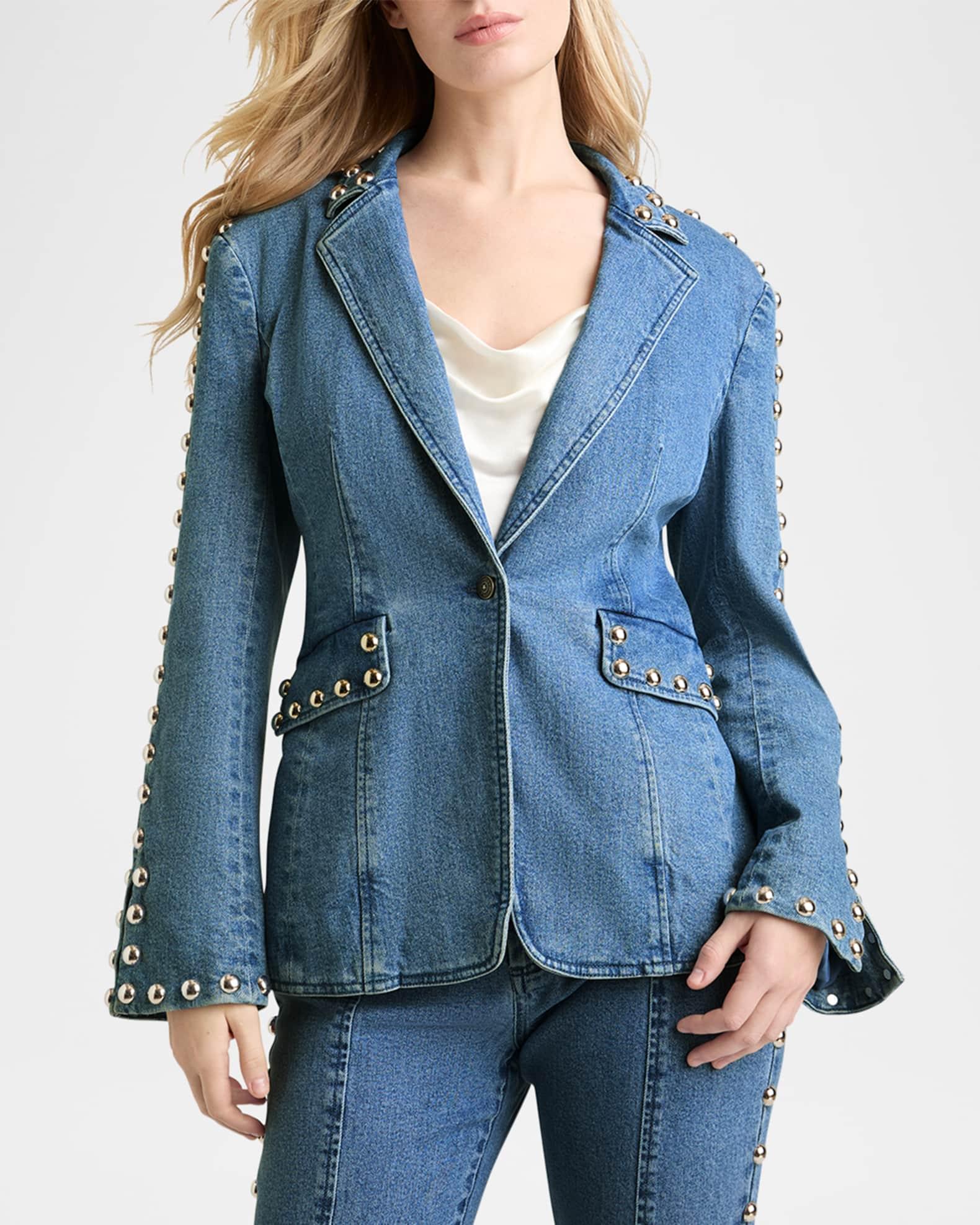 Cinq a Sept "Milly" denim jacket featuring studded trim Notch lapels Single-breasted front Long sleeves with split cuffs; approx. 32.3"L Hip flap pockets Tailored fit Vented back Button-front Cotton/spandex Lining: Polyester Dry clean Imported