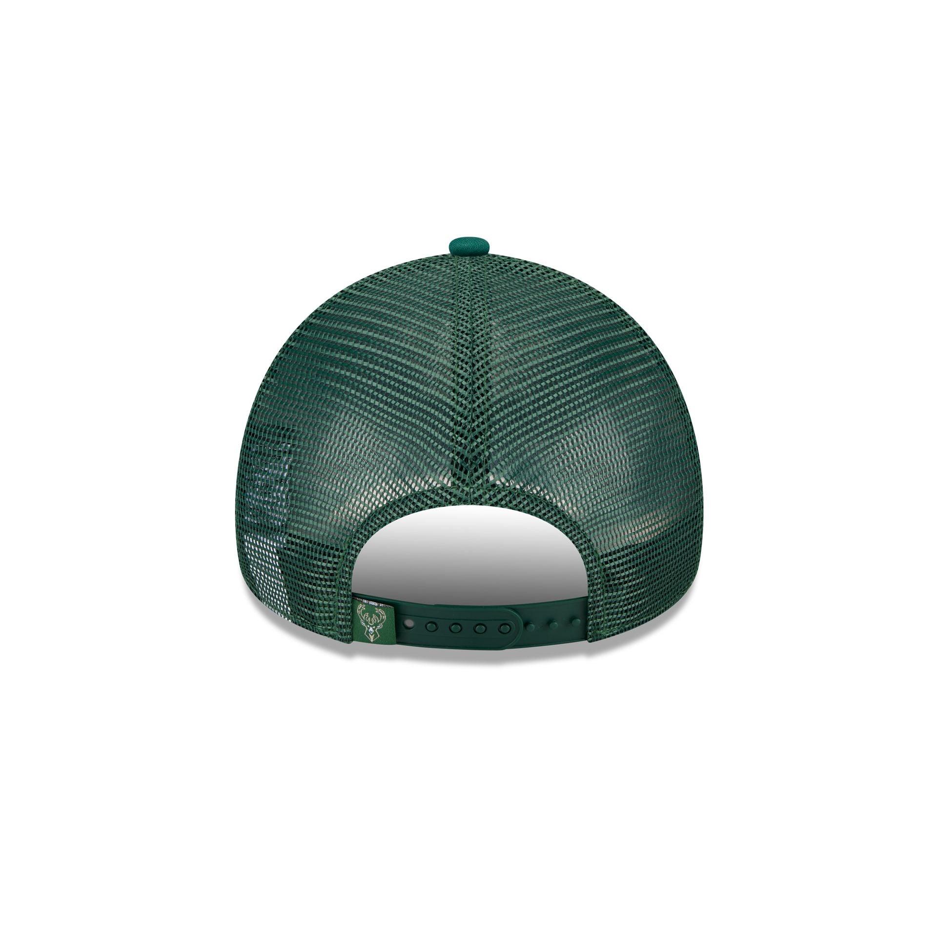 The Milwaukee Bucks Distressed 9FORTY A-Frame Trucker features a distressed screen-printed Bucks wordmark and logo at the front panels with a team tag at a snapback closure at the rear and a green undervisor.