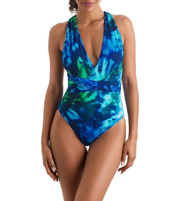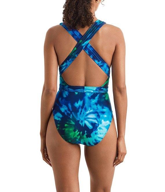 From Mimi Flamingo, this one piece swimsuit features: Buttery soft sustainable fabrication Halter silhouette Tie dye print Plunge neckline Removable soft cups Fixed straps Cross back Moderate coverage Fully lined Pull-on construction Recycled nylon/elastane Hand wash Imported.