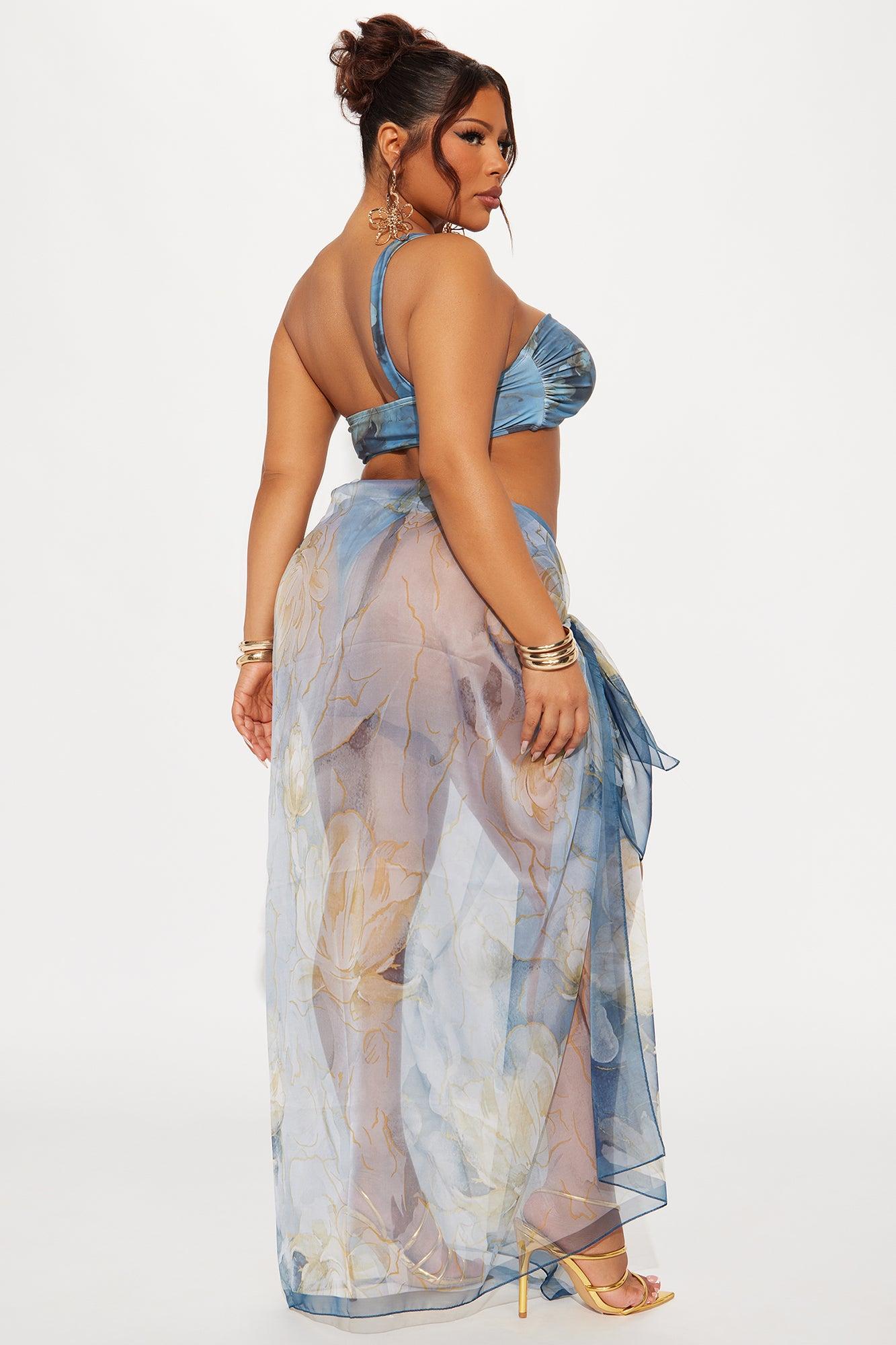 Available In Blue/combo. 3 Piece Bikini Set Floral Print Bandeau Bikini Top One Shoulder Removable Cups Side Strap Bikini Bottom, Cheeky Matching Swim Cover Up Sarong Maxi Full Stretch Final Sale Disclaimer: Print Placement May Vary. Shell/Lining: 82% Polyester 18% Spandex Cover Up: 100% Polyester Imported