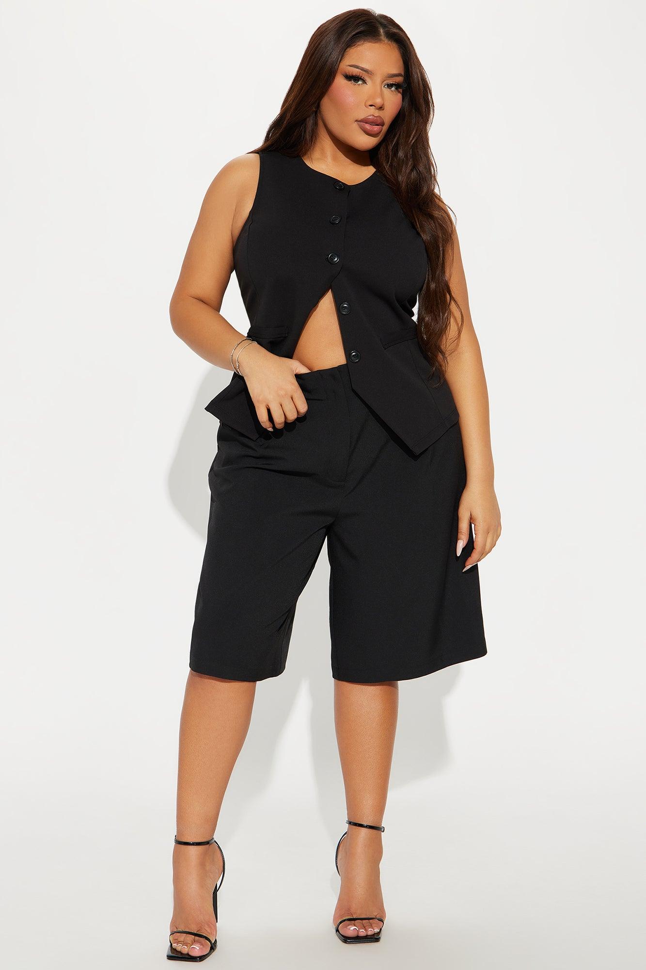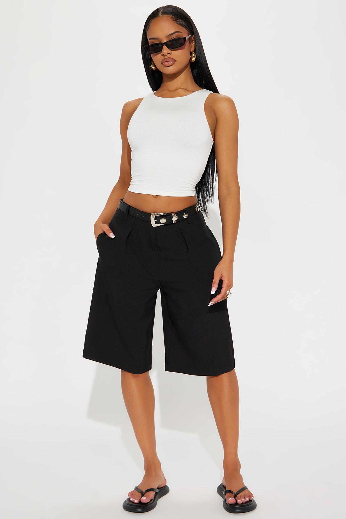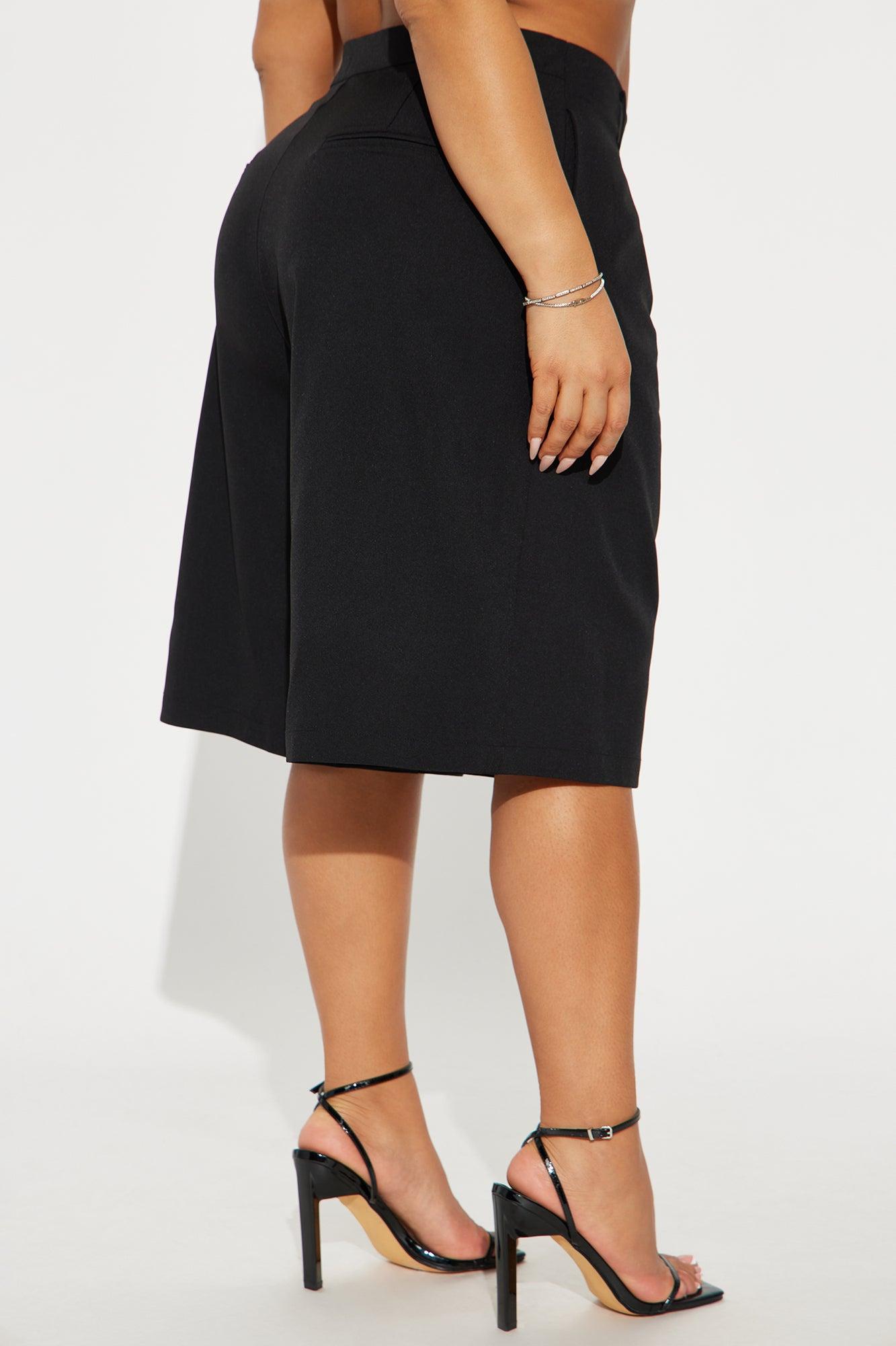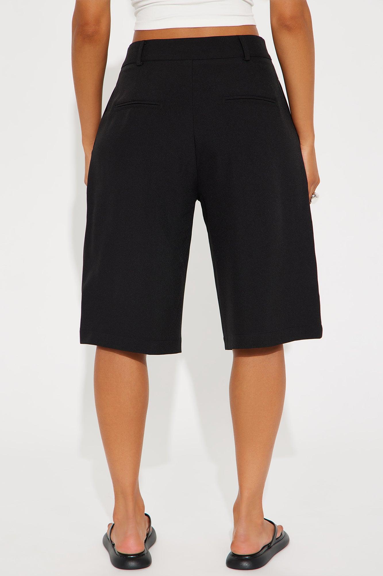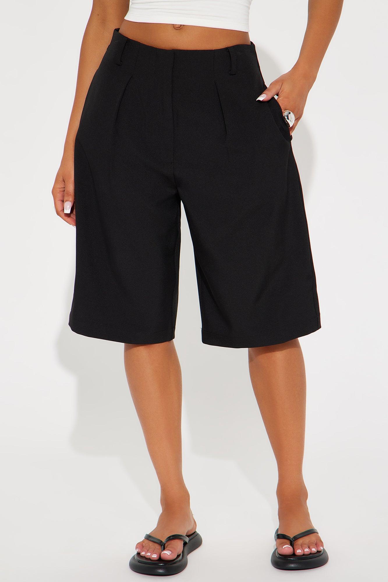 Available In Black And Cream. Bermuda Trouser Short Mid Rise Hook & Eye Closure Zip Fly Faux Back Welt Pockets Pleated Front Non Stretch Self 97% Polyester 3% Spandex Imported California Proposition 65 WARNING: Cancer and Reproductive Harm - www.P65Warnings.ca.gov.