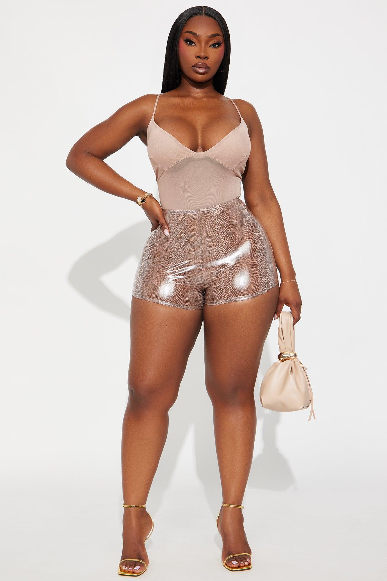 Available In Tan/Multi. Regular Straight Short Elastic Waistband High Rise Sheer Snakeskin Print Latex Stretch 1.5" Inseam 93% Polyester 7% Spandex Imported California Proposition 65WARNING: Cancer and Reproductive Harm - www.P65Warnings.ca.gov.