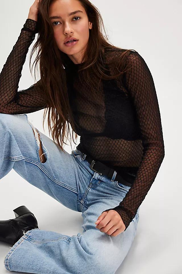 Your new fav layering top: This sheer long sleeve from Intimately is featured in the perfect textured style with a ruffled mock neckline for a femme touch.