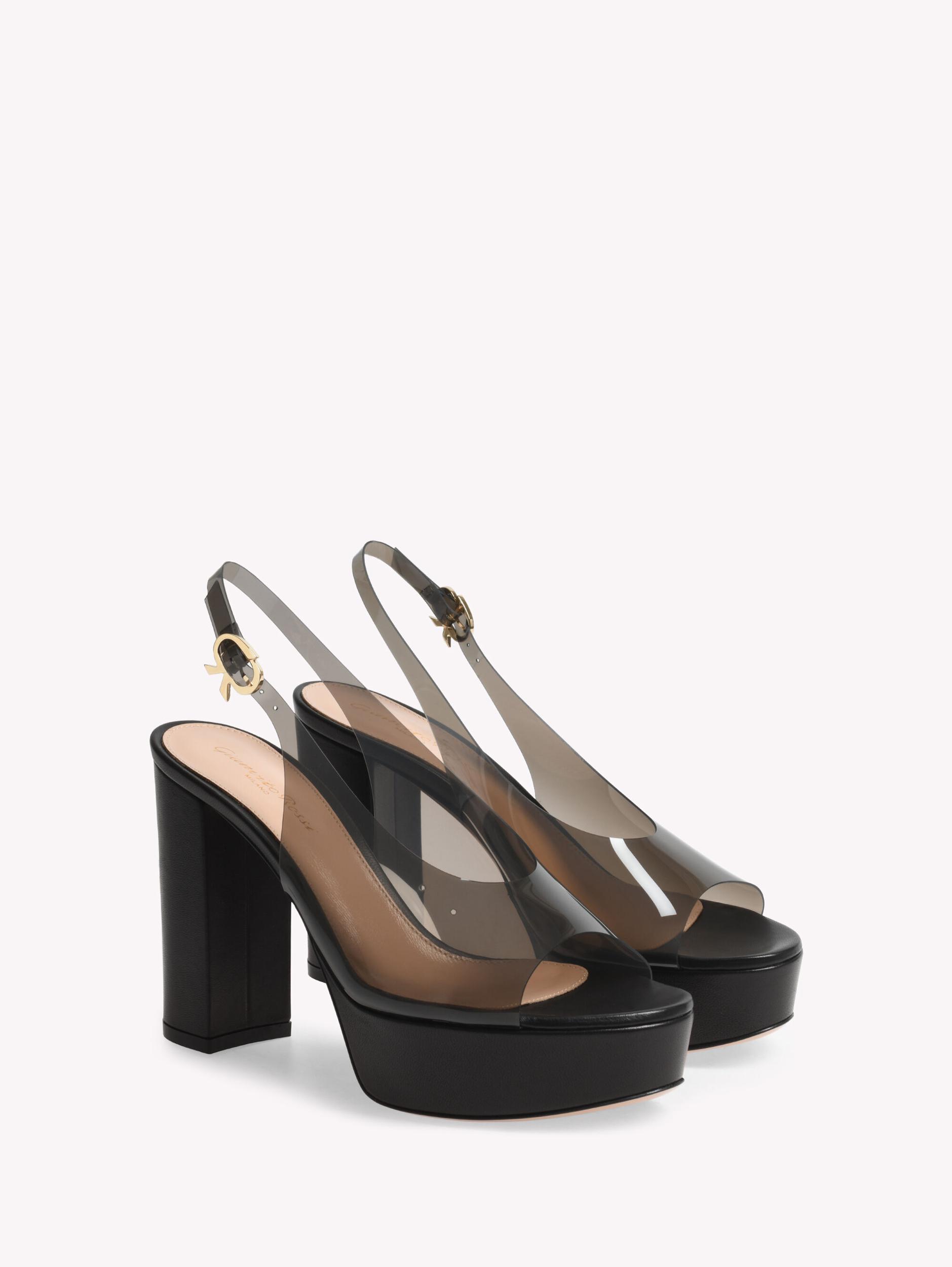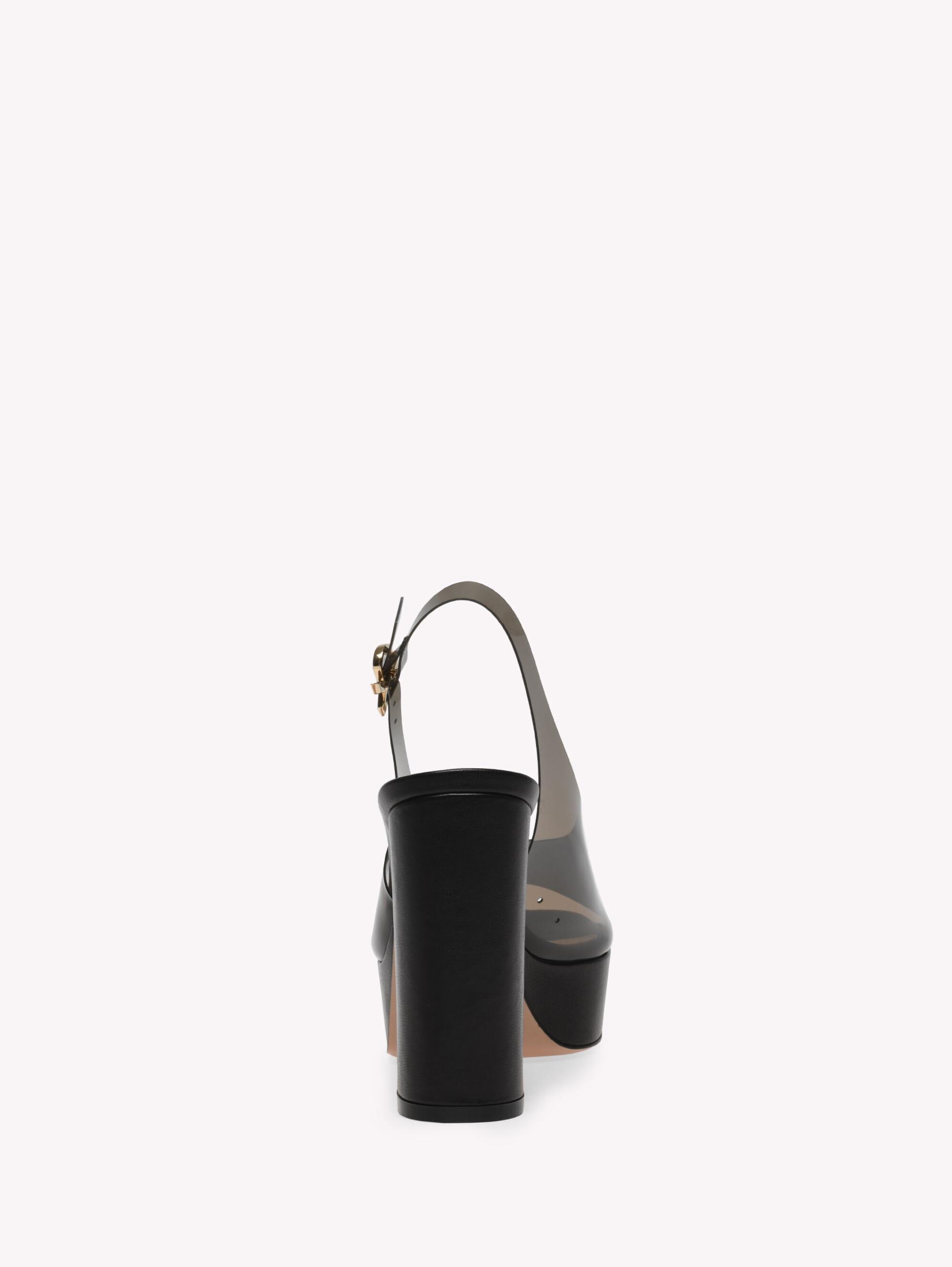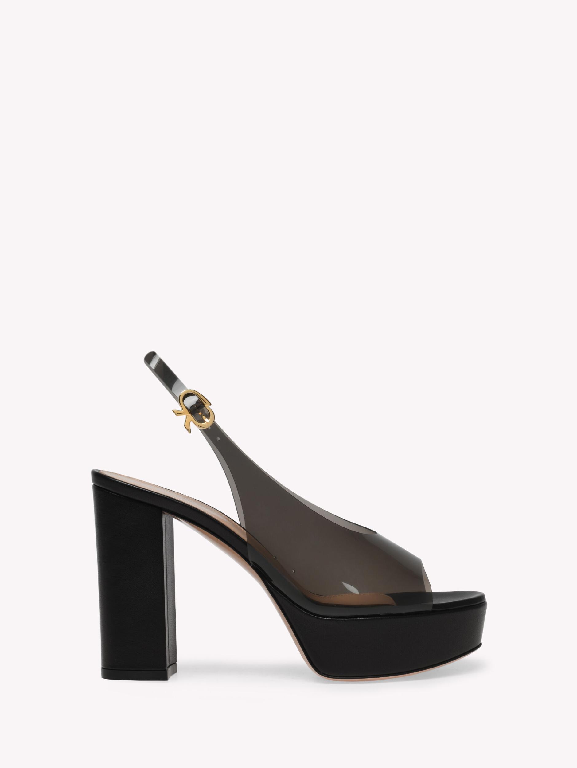 Crafted from leather, Mindy is a round toe slingback sandal with a 35mm platform and 105mm chunky heel. The upper is made of soft see-through Plexi and finely adorned with the signature Ribbon buckle. Handmade in Italy.