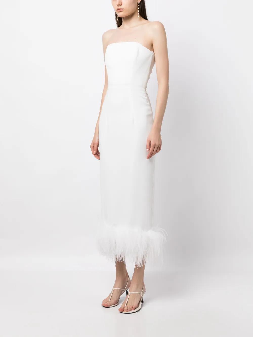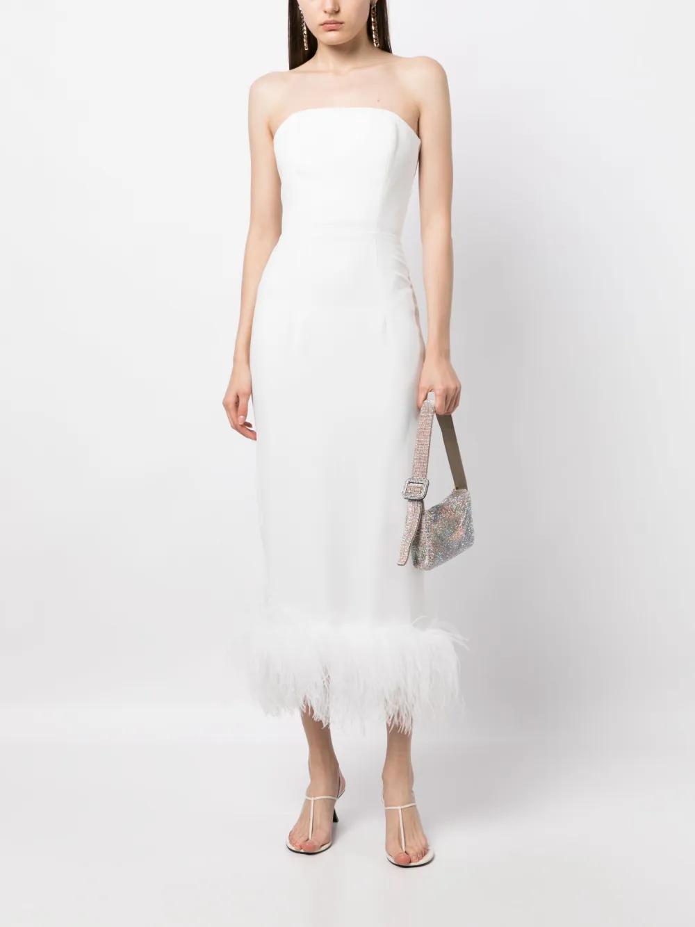 16ARLINGTON's Minelli dress shares the name of famed actress Liza Minelli who was known for her glamorous evening wear choices. This strapless iteration has a boned bodice and a central vent for unrestricted movement. The ostrich-feather trim at the hem sways with each step.