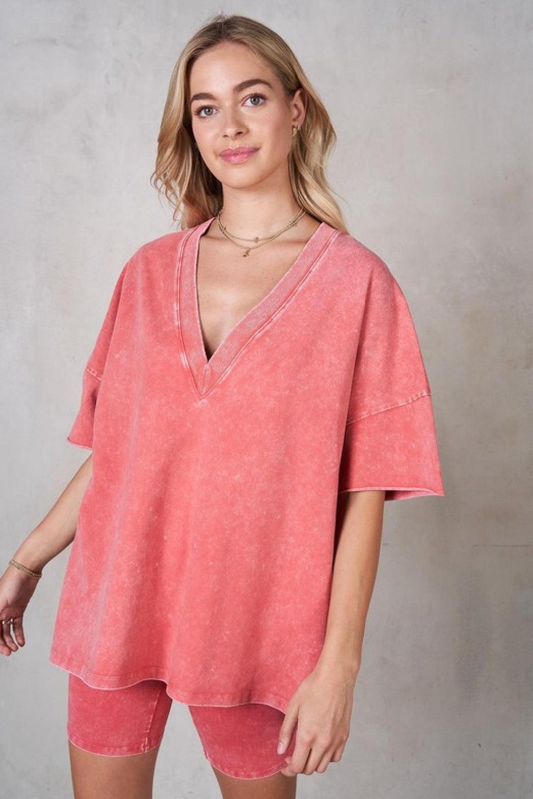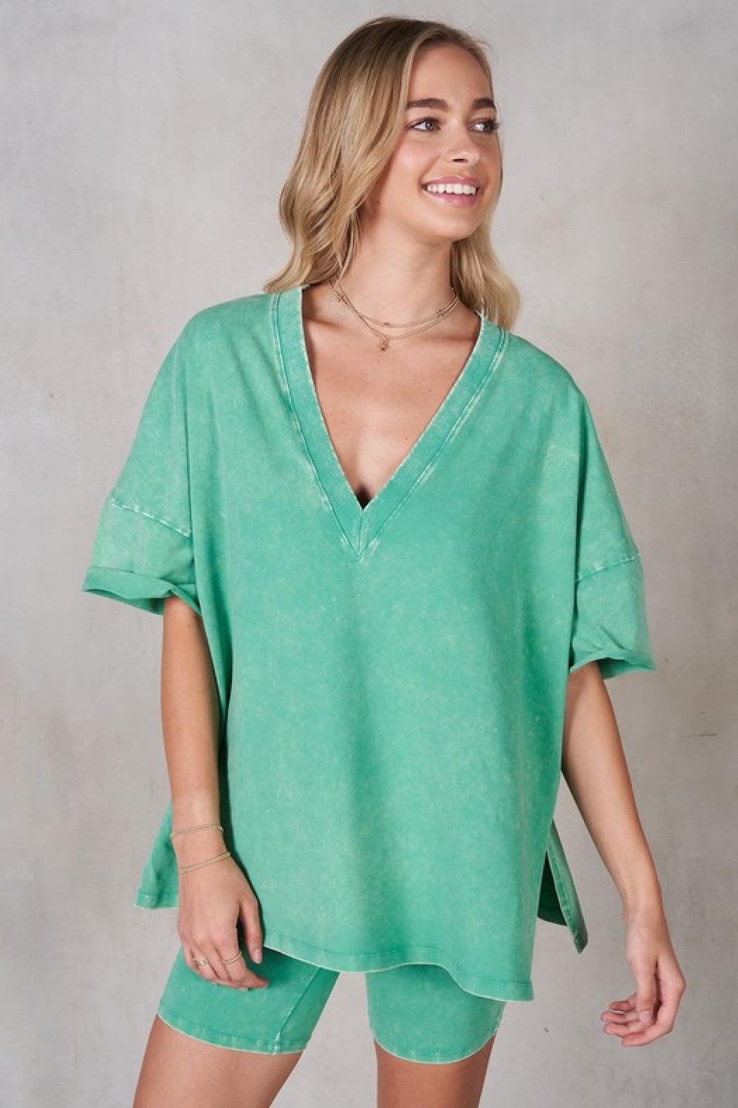 Mellie Mineral Wash Set | Mellie set is a mineral washed t-shirt featuring a short sleeves, v neck, and a relaxed fit paired with biker shorts featuring with a high-rise ribbed waist.
