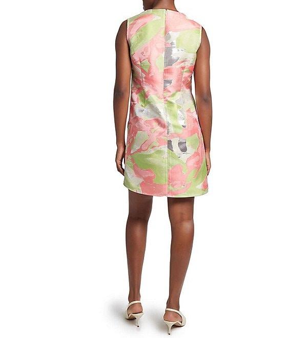 From Ming Wang, this dress features: Jacquard woven fabrication Abstract print Sheath silhouette Split v-neckline Sleeveless Lined Straight hem Back zip closure Approx. 36" length Polyester/metallic; lining: polyester/spandex Machine wash Imported.