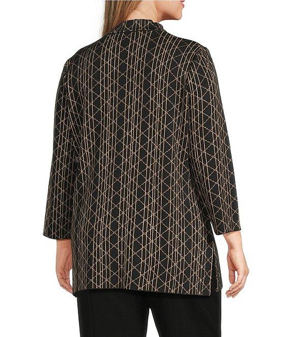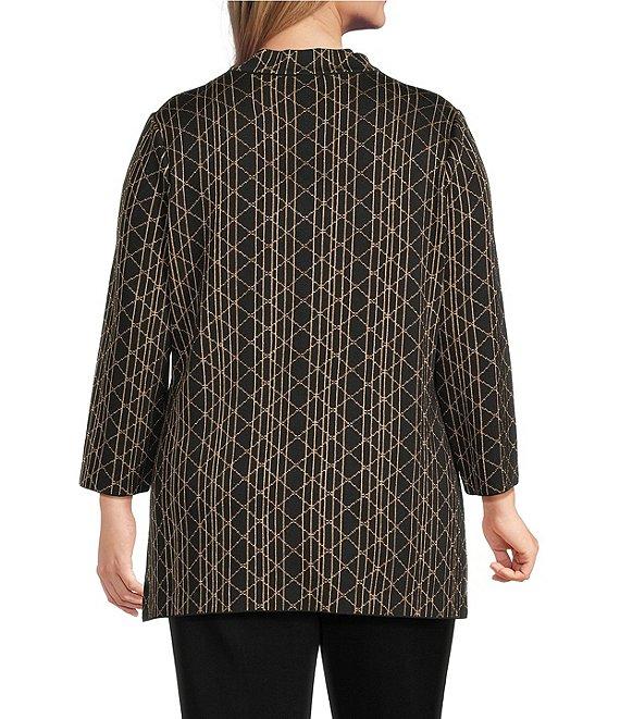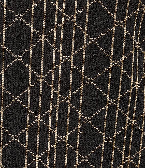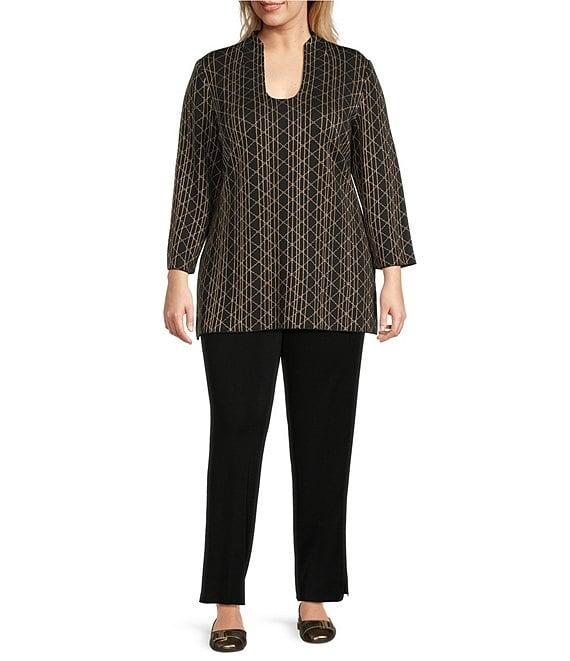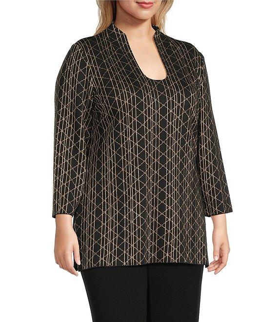 From Ming Wang, this tunic features: Lurex knit fabrication Art deco print Stand collar scoop neckline Bracelet sleeves Straight hem Pullover construction Approx. 30" length Rayon/polyester/nylon/metallic Machine wash Imported.