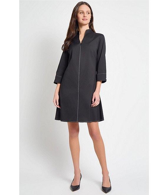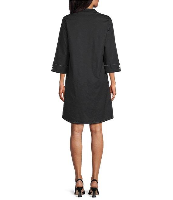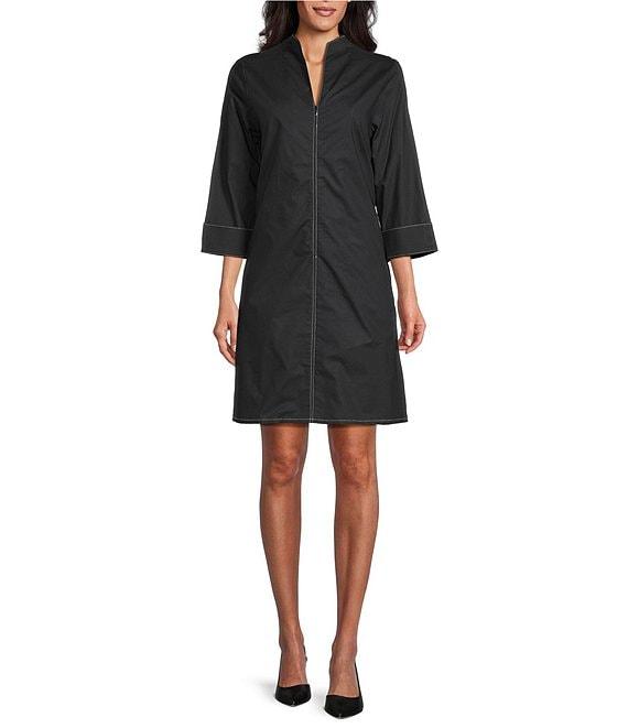 From Ming Wang, this dress features: Cotton woven fabrication A-line silhouette Half zip mandarin collar neckline 3/4 sleeves with button cuffs Side pockets Straight hem Zip front closure Pullover construction Approx. 37" length Cotton/spandex Machine wash Imported.