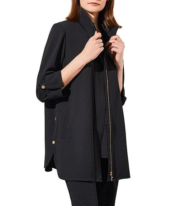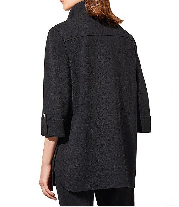 From Ming Wang, this jacket features:Lightweight deco crepe fabricationShirt jacket silhouetteOpen lapel collar3/4 cuffed button tab sleevesSide front welt pocketsButton trim detail at front sides Curved hemline with side slitsCenter front hidden zipper placket closureApprox. 30" length Polyester/spandexHand washImported.