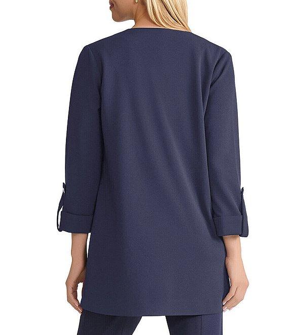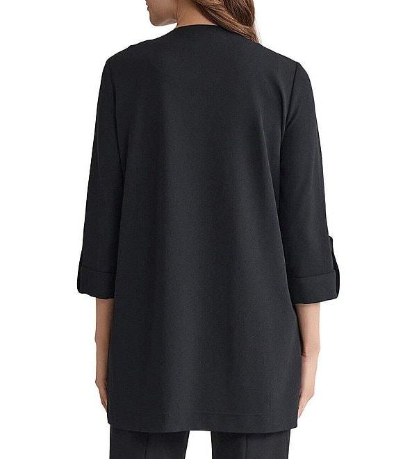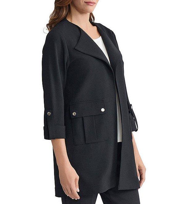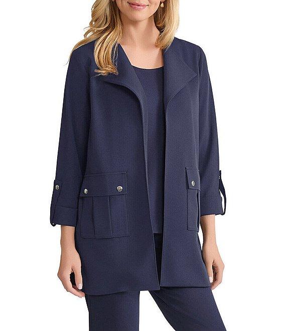 From Ming Wang, this jacket features: Lightweight stretch deco crepe fabrication Wing collar neckline Long roll-tab sleeves Front patch flap pockets Snap pocket closure Approx. 32" length Straight hem No closure Polyester/spandex Hand wash Imported.