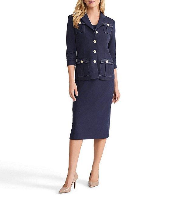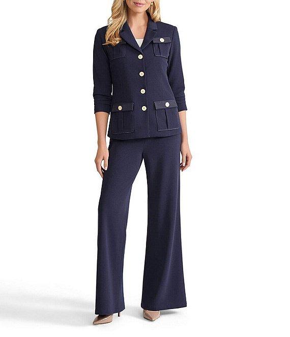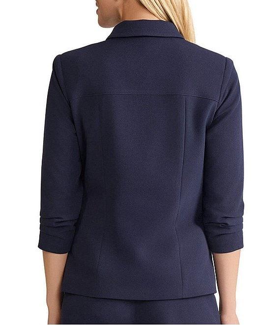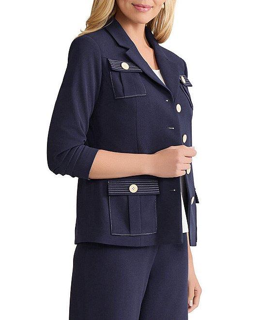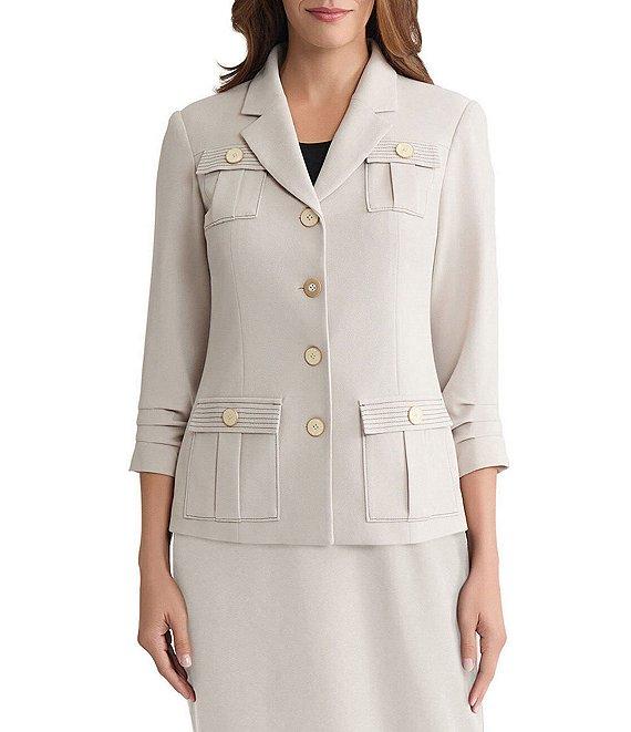 From Ming Wang, this jacket features: Stretch deco crepe fabrication Notch collar neckline Ruched elbow sleeves Front button flap patch pockets Contrast stitching detail Straight hem Button front closure Approx. 25" length Polyester/spandex; lining: polyester/spandex Hand wash Imported.