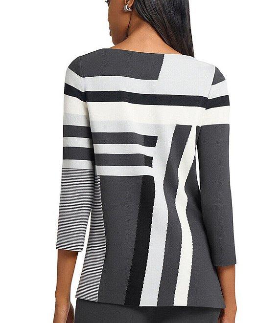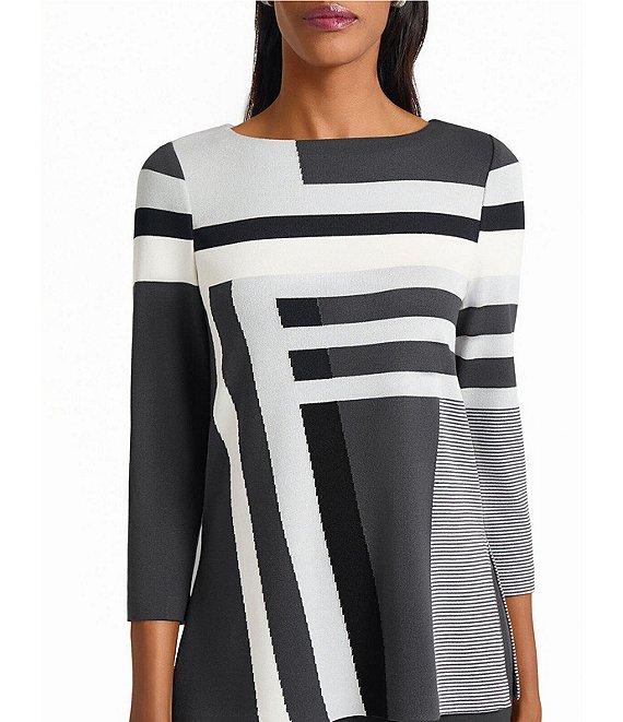 From Ming Wang, this tunic features: Soft knit fabrication Color block stripe pattern Boat neckline 3/4 sleeves Straight hem Pullover construction Approx. 28" length Rayon/polyester Machine wash Imported.