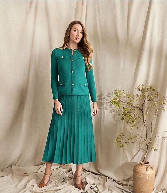 From Ming Wang, this cardigan features: Soft knit fabrication Heritage fil Crew neckline Long sleeves Front faux patch pockets Straight hem Button front closure Approx. 23" length Rayon/polyester Machine wash Imported.