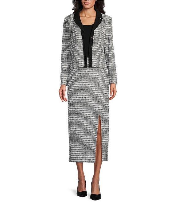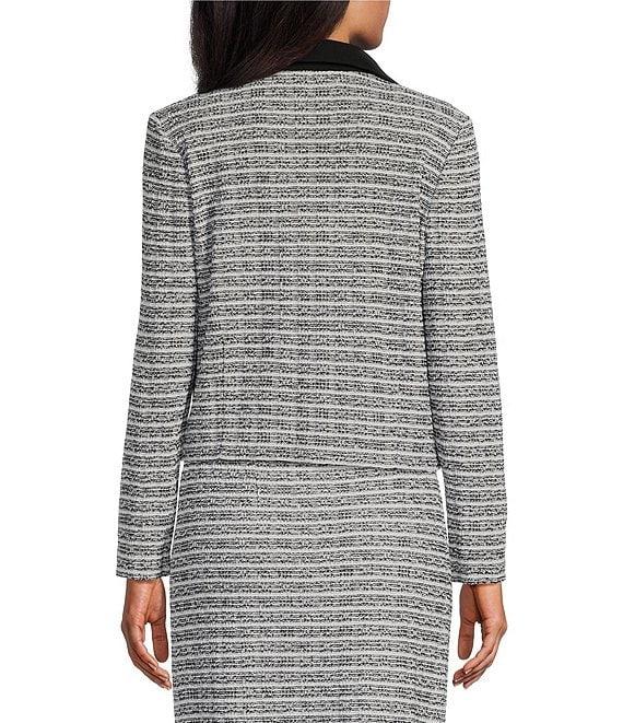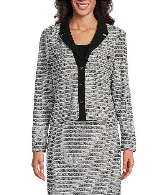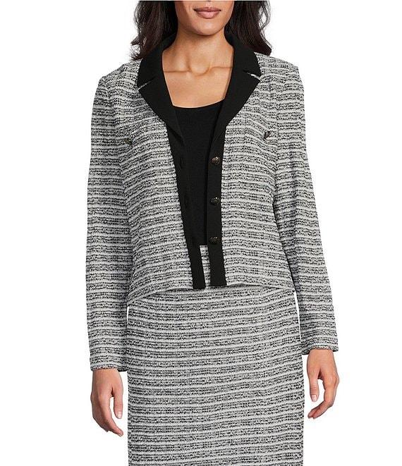 From Ming Wang, this jacket features: Mixed-media fabrication Notch collar Long sleeves Stripe pattern Shoulder pads Unlined Functional patch pockets with button detail Cropped length Straight hemline Button-front closure Approx. 20" length Polyester/spandex; shoulder pads: acrylic/nylon/rayon Hand wash Imported.