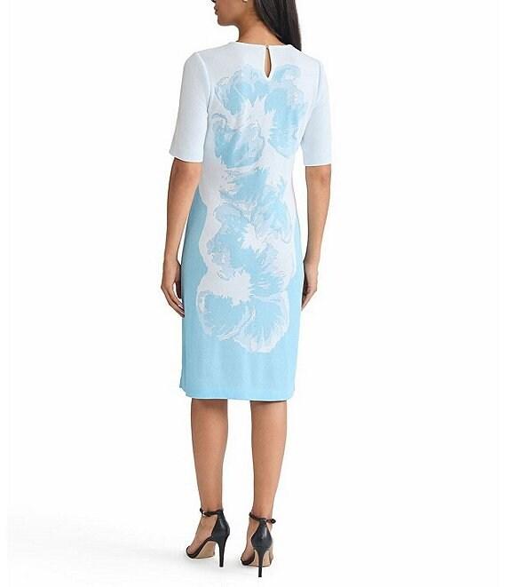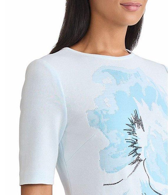 From Ming Wang Petite, this dress features: Floral jacquard knit fabrication Sheath silhouette Round neckline Short sleeves Straight hem with side slits Back keyhole button closure Approx. 40" length Acrylic/nylon Machine wash/tumble dry Imported.
