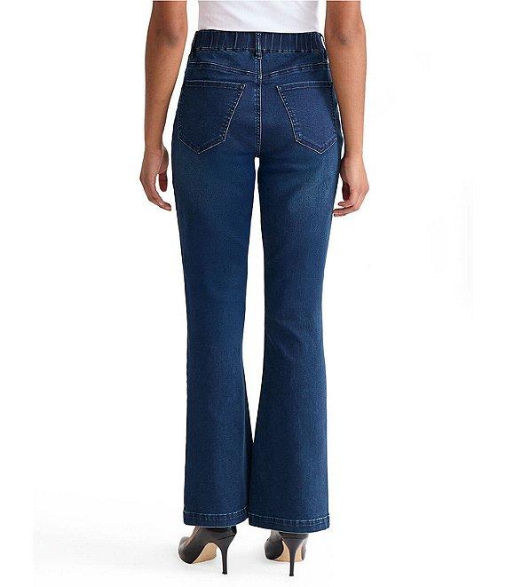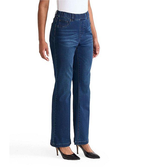 From Ming Wang, this jean features: Denim fabrication Elastic waistband Flare boot cut 5-pocket styling Pull-on construction Approx. 32" length Cotton/polyester/spandex Hand wash Imported.