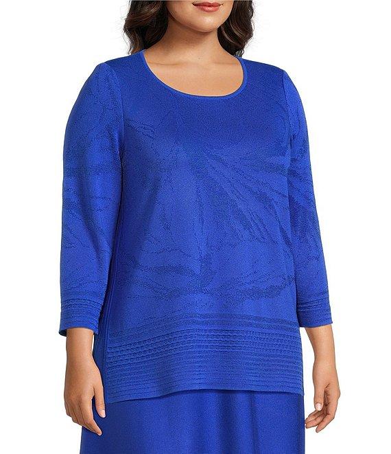 From Ming Wang Plus, this tunic features: Floral burnout knit fabrication Tunic silhouette Boat neckline Bracelet sleeve Straight hem with side slits Pullover construction Approx. 30" length Rayon/polyester/nylon Machine wash Imported.