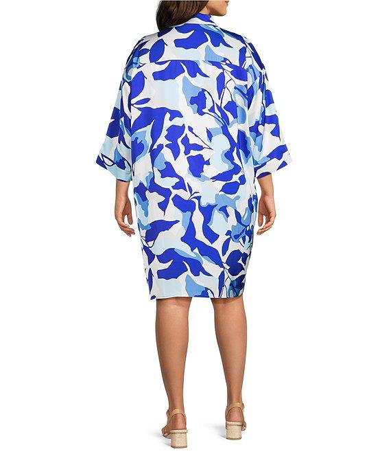 Ming Wang Plus Size Floral Print Crepe De Chine Split Collar Elbow Sleeve Dress