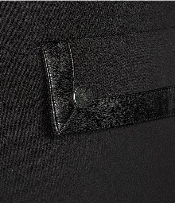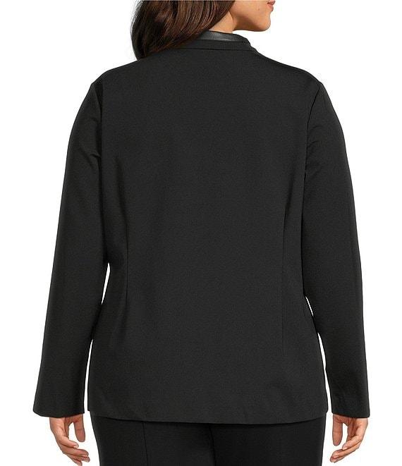 From Ming Wang Plus, this jacket features: Stretch ponte fabrication Faux leather trim Stand collar neckline Long sleeves Side flap pockets Straight hem Open front Approx. 28" length Rayon/nylon/spandex Hand wash Imported.