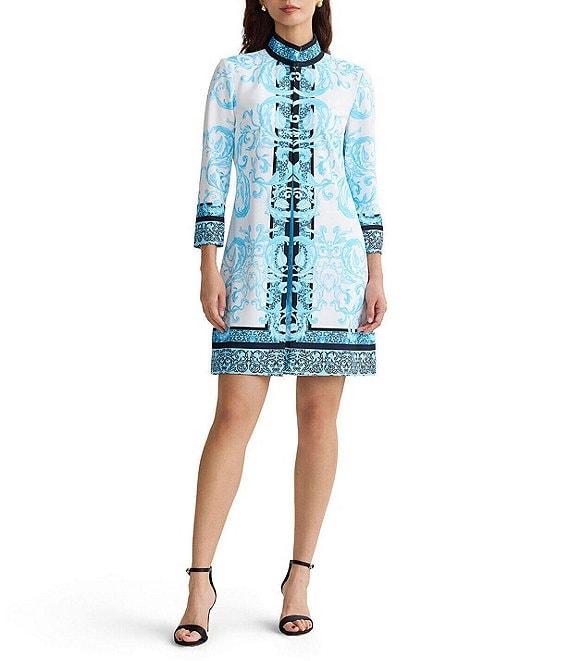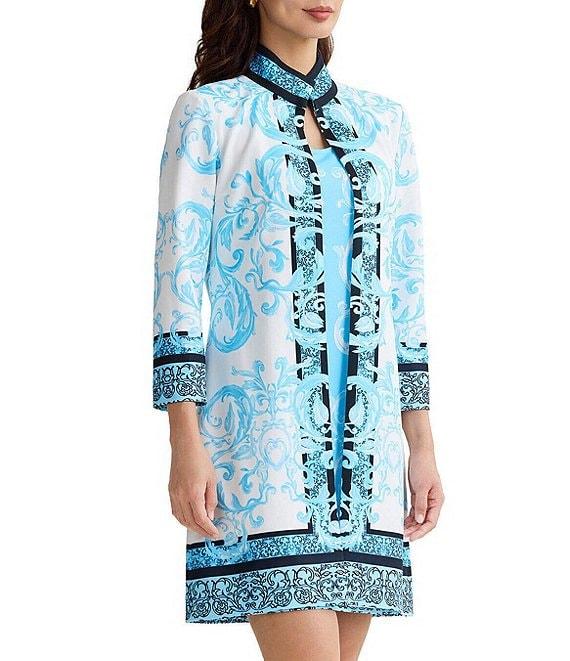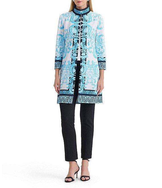 From Ming Wang, this jacket features: Printed stretch deco crepe fabrication Stand collar neckline Bracelet sleeves Bust darts Straight hem Hook front closure Approx. 36" length Polyester/spandex; lining: polyester/spandex Hand wash Imported.