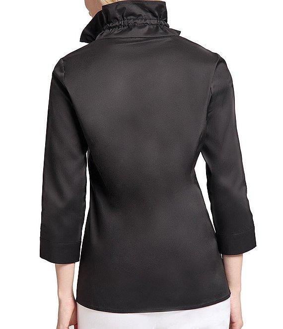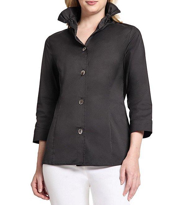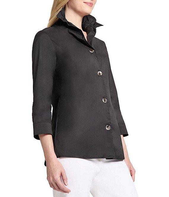 From Ming Wang, this top features: Stretch cotton poplin fabrication Ruffle stand collar 3/4 sleeves Straight hemline Button-front closure Approx. 28" length Cotton/nylon/spandex Hand wash/flat dry Imported.