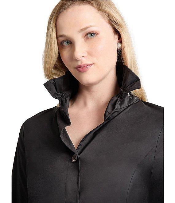 Ming Wang Stretch Cotton Poplin Ruffle Stand Collar Button Front Top