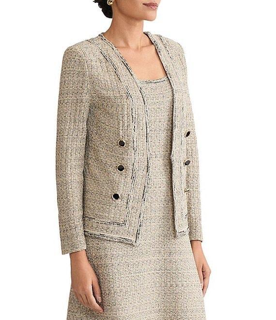 From Ming Wang x Tanya Foster, this jacket features: Tweed knit fabrication Double-breasted silhouette V-neckline Long sleeves Faux front buttons Straight hem Hook-front closure Approx. 23" length Acrylic/nylon/rayon/metallic Machine wash Imported.