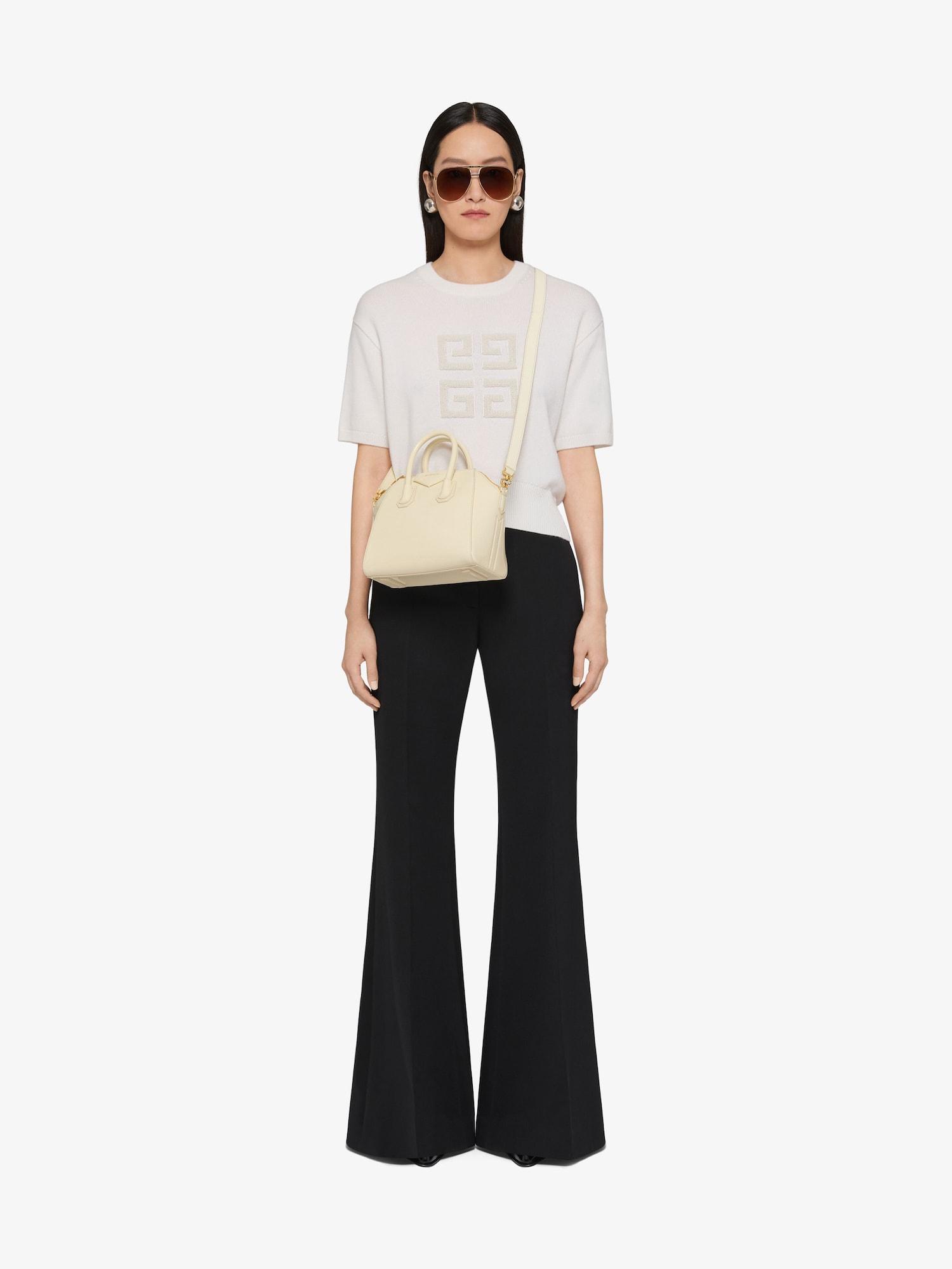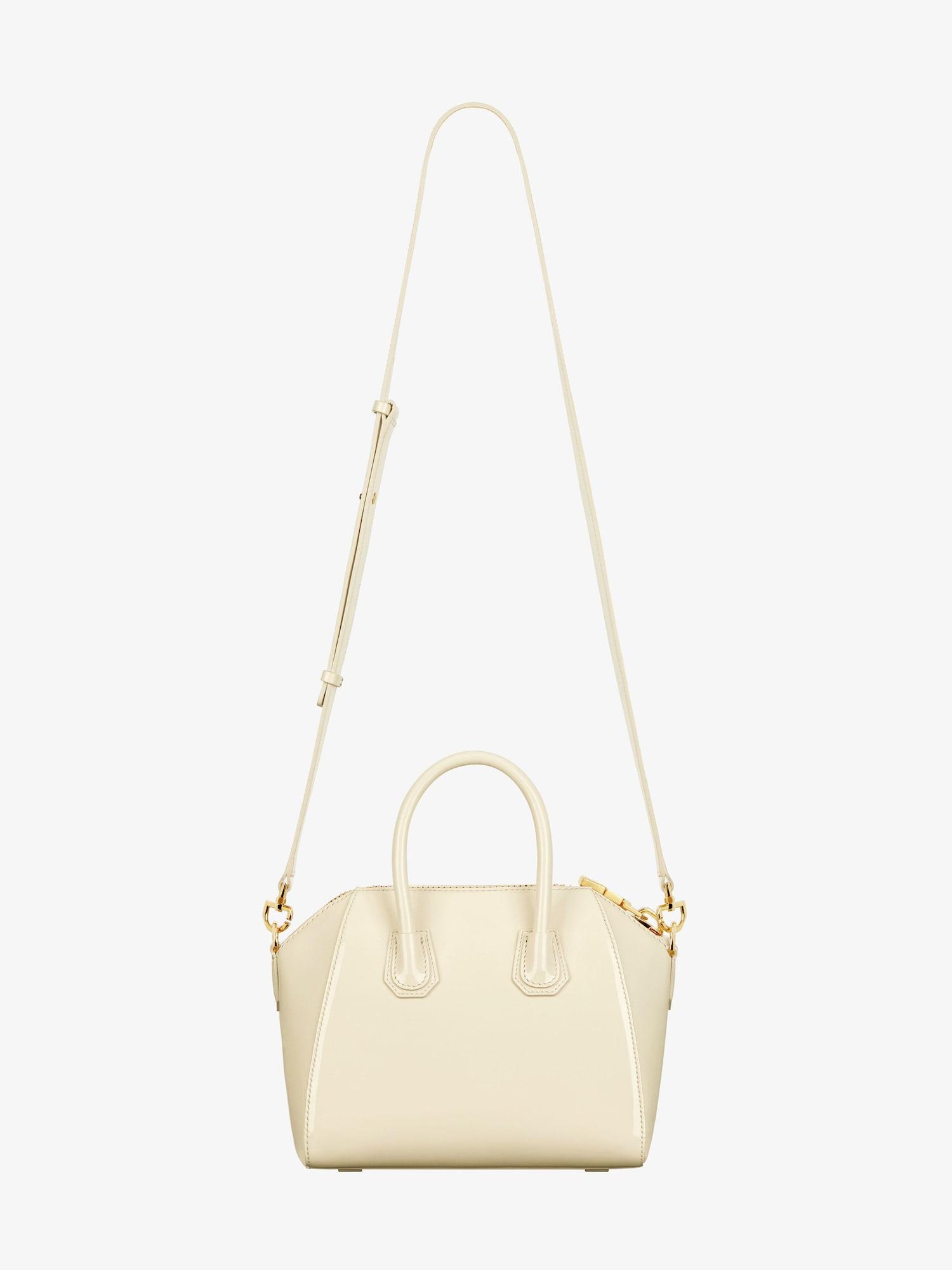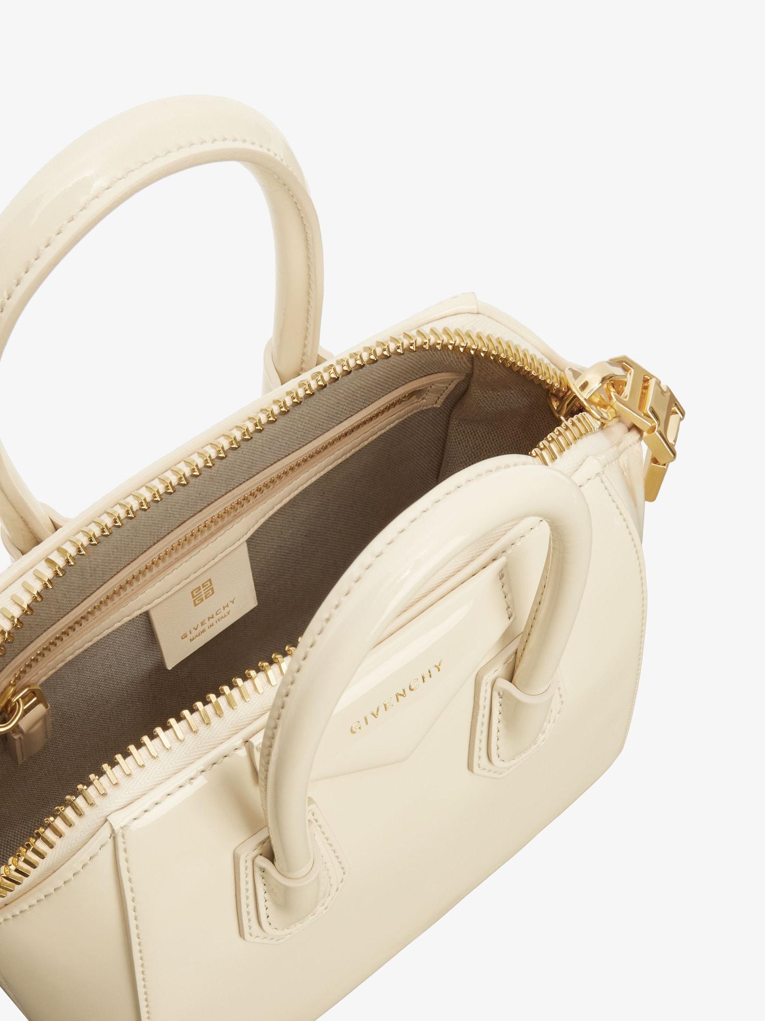Mini handbag or crossbody bag in patent calfskin leather. Antigona line. Zipper closure with GIVENCHY 4G zipper pull. Leather handles. Adjustable and removable leather shoulder strap. Pentagonal patch with GIVENCHY signature in 3D printing . Golden-finish metal details. One main compartment with one zippered pocket inside.