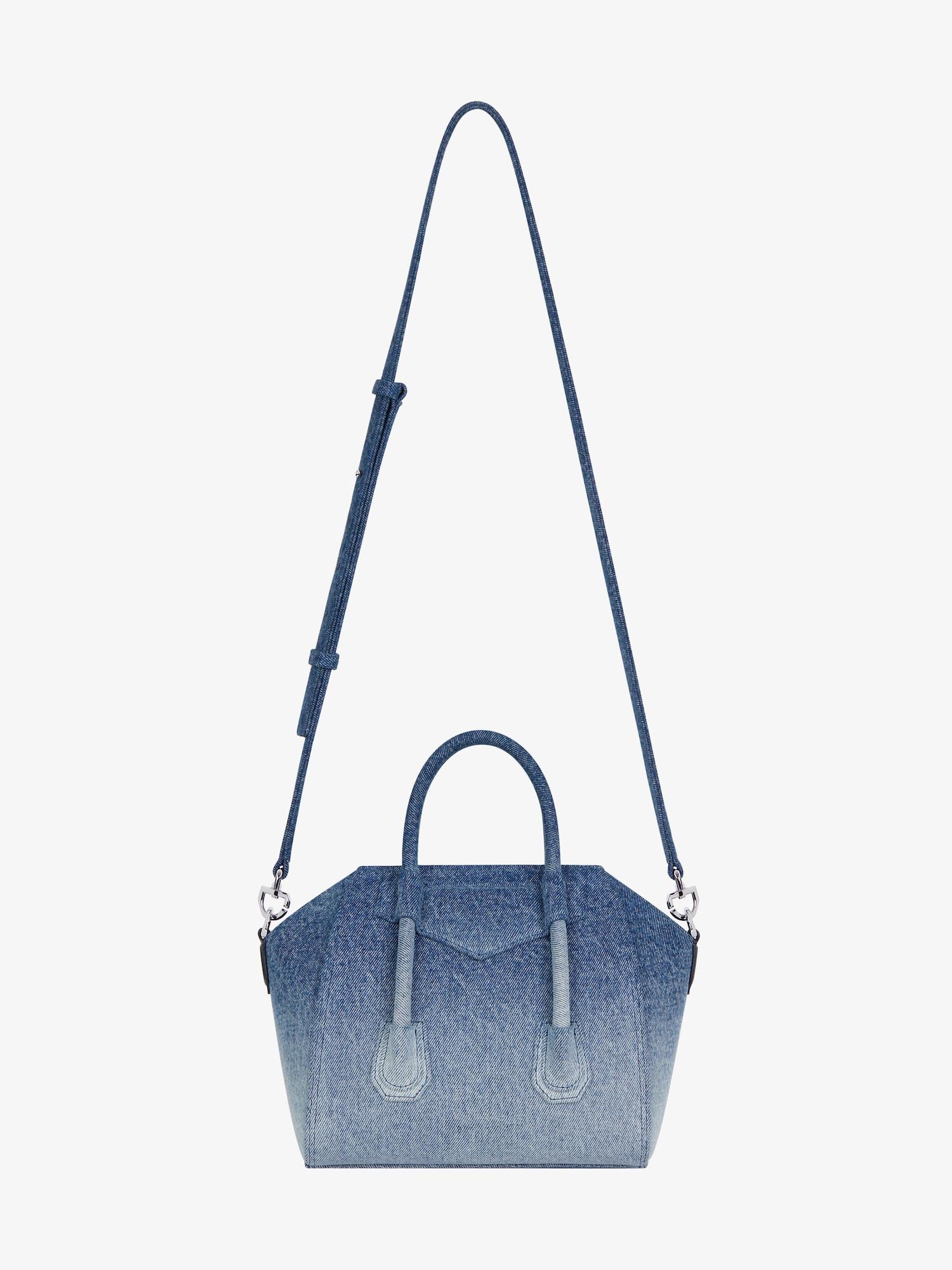 Mini handbag or crossbody bag in denim with gradient effect. Antigona Lock line. Magnetic closure. Adjustable and removable denim shoulder strap. Pentagonal patch with removable 4G padlock on the front. Pentagonal patch on the back. Silvery-finish metal details. One main compartment, one flat pocket and one flat zippered pocket inside.