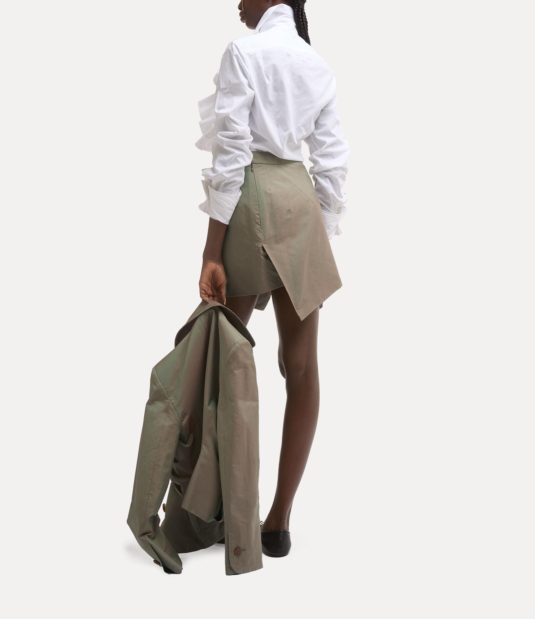 Our Mini Infinity skirt is made from a cotton blend gracefully wraps around the hips, featuring a mid-rise waistband that shapes a sleek, structured A-line silhouette with an asymmetric finish. The design fastens with a concealed zip and an amber-toned button, all in a washed sage green hue.
