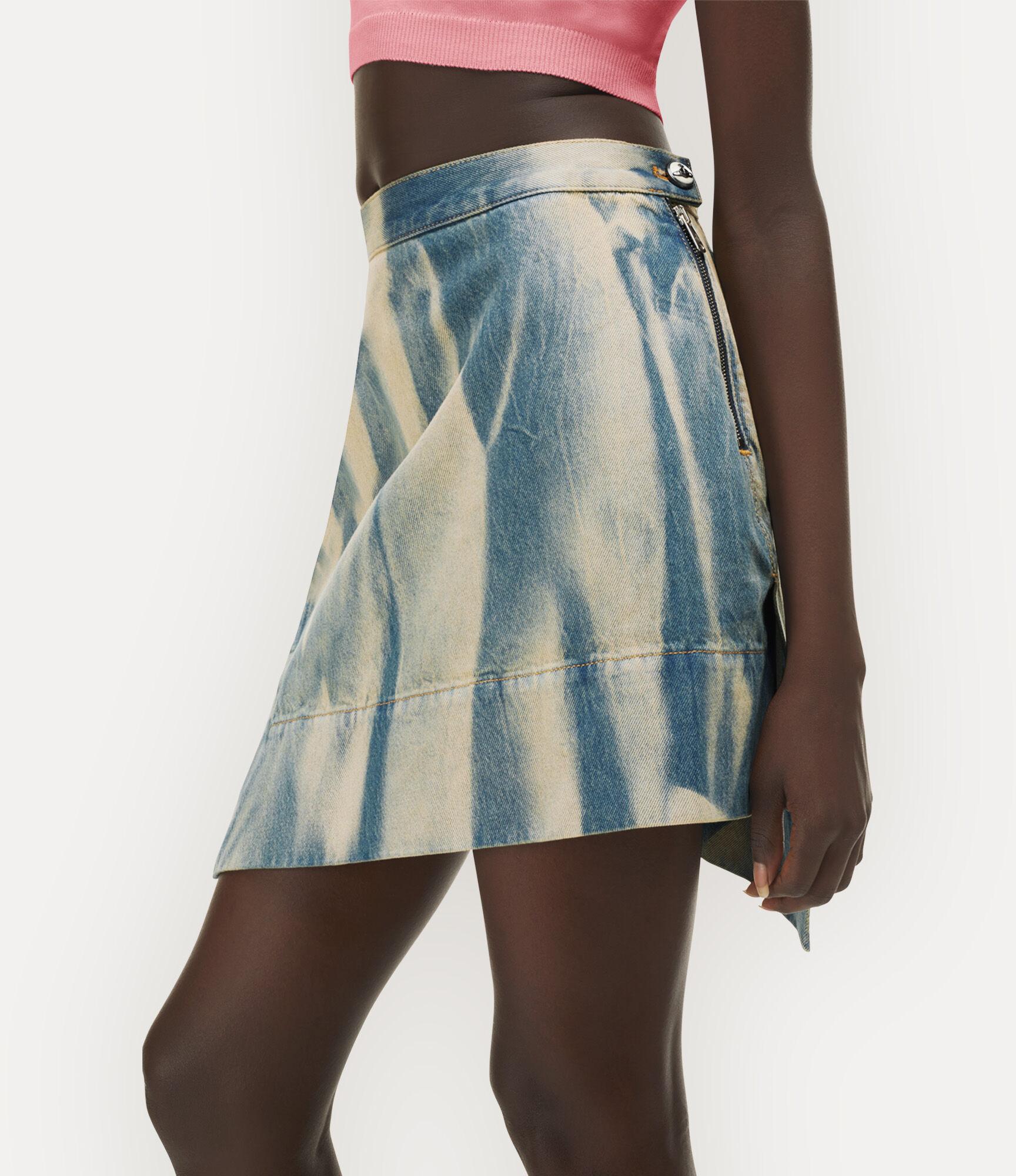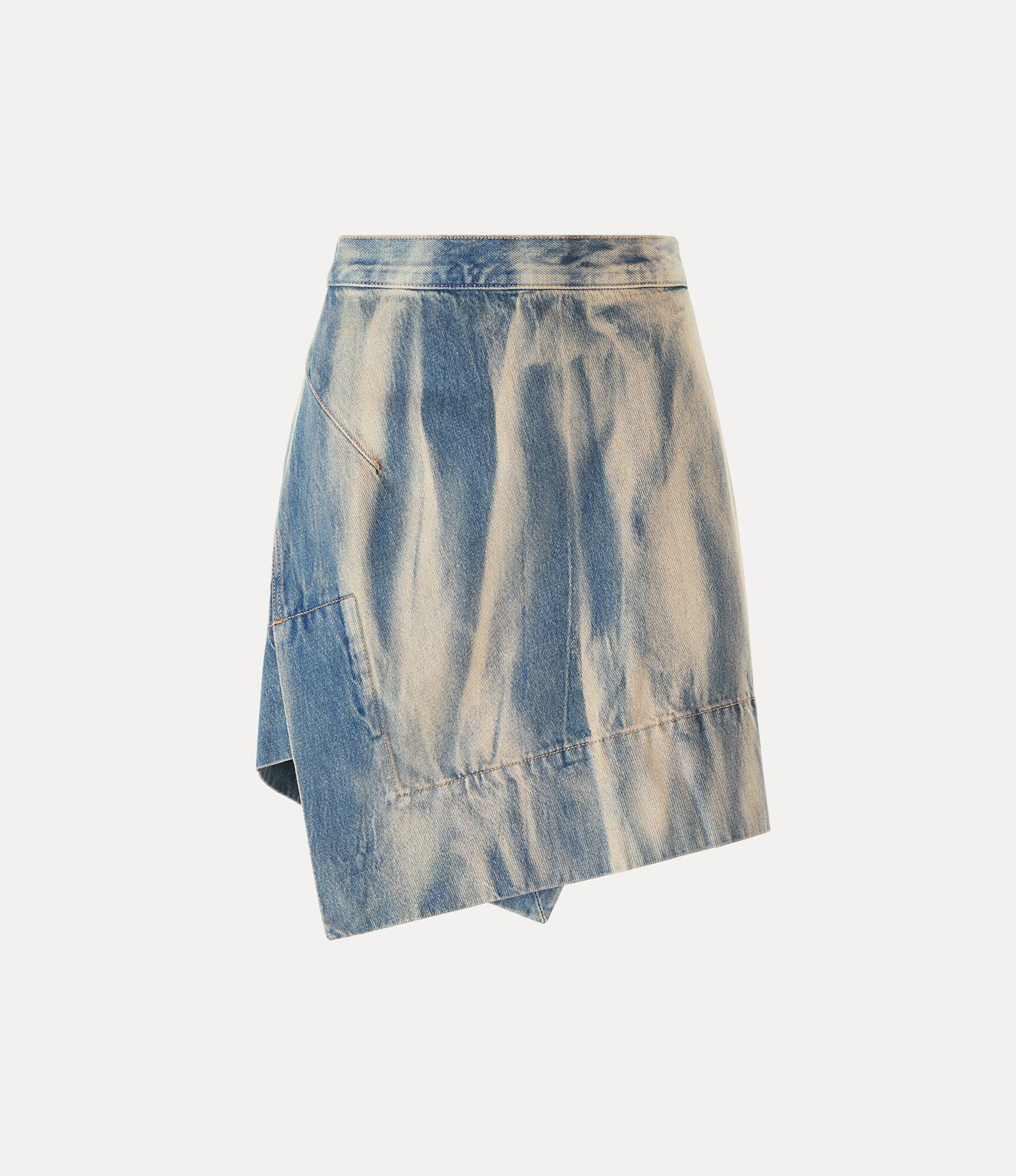 Our Mini Infinity skirt features a soft cotton profile, adorned with a faded, bleached wash for a distressed, vintage-inspired look. The piece offers a wrap-style front that fastens with a concealed button, complete with a mid-rise waistband that falls into an asymmetric A-line shape.