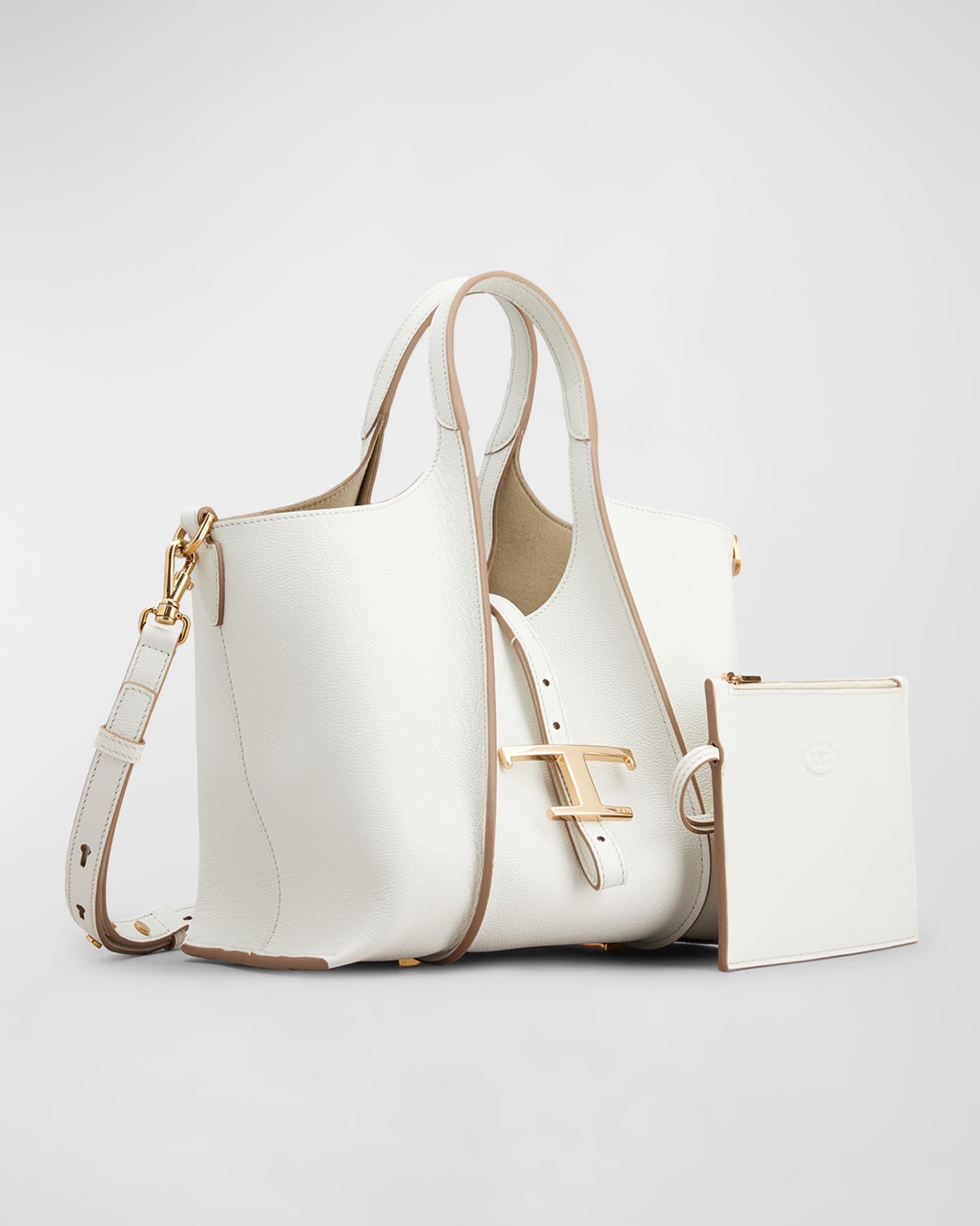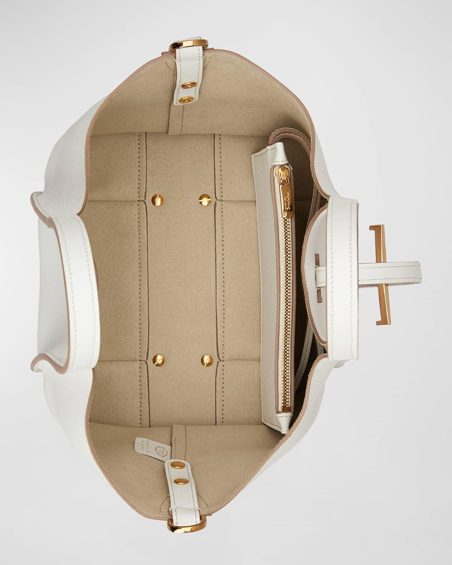 Tod's shopping tote bag in leather Flat top handle Detachable, adjustable shoulder strap Can be worn as a top handle or shoulder bag Open top with adjustable T logo center strap Interior, leashed zip pouch bag Lining: Nylon Feet protect bottom of bag Approx. 7.6"H x 11.8"W x 4.7"D Made in Italy
