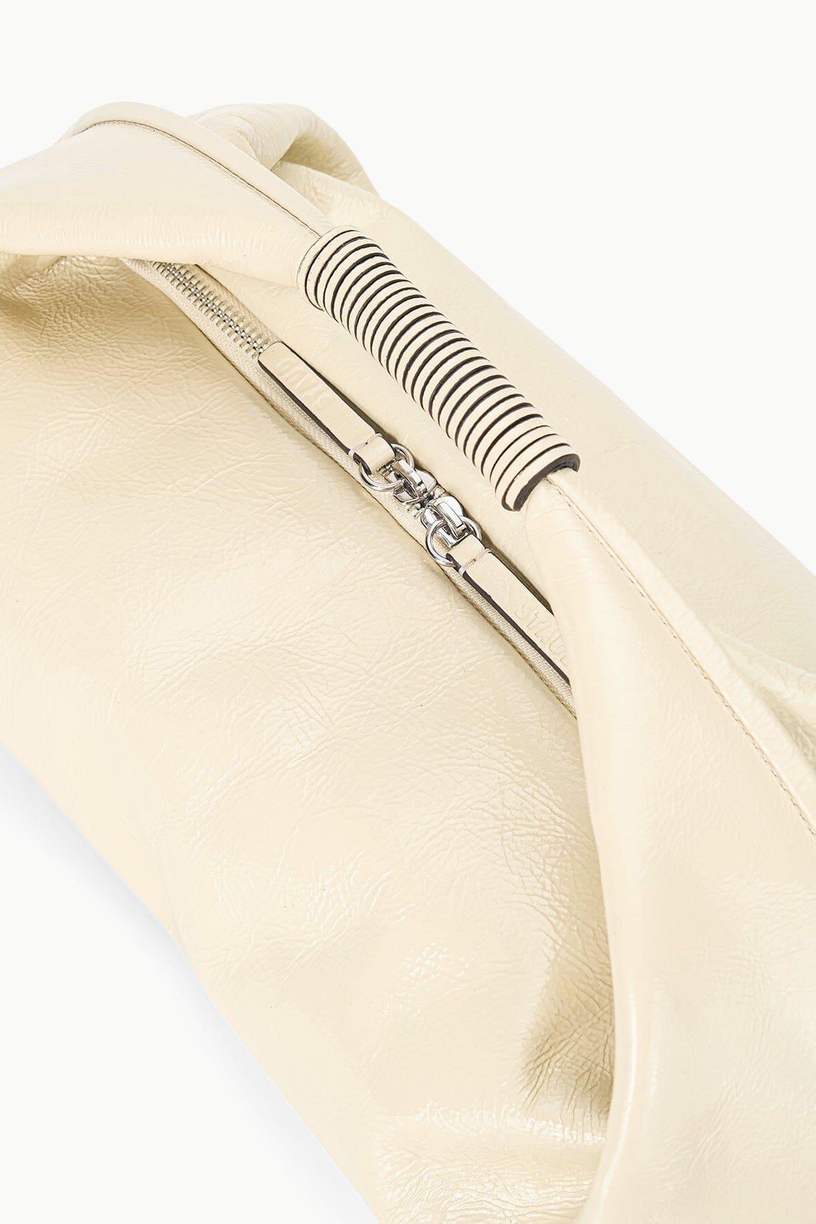 The Mini Ronnie is a slouchy mini shoulder bag crafted in crinkled cream leather. This style features a signature leather wrapped handle, zip closure, and an interior zip pocket.