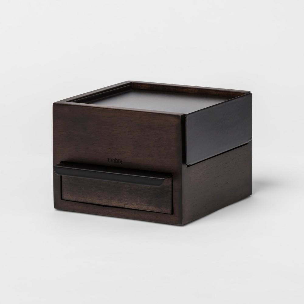 Introducing Mini STOWIT by Umbra. No more messy jewelry drawer - with Mini STOWIT jewelry box, you get stylish storage and a functional organizer in one. Use Mini STOWIT to keep all your favorite jewelry pieces in one place, making them easy to access. Multiple hidden compartments of various sizes allow you to store your rings, earrings, bracelets, watches, necklaces and other accessories in different configurations depending on what works best for you. Each drawer features a linen pad to keep your jewelry from shifting around or getting damaged. The simple, modern design of Mini STOWIT is an attractive addition to your dresser, nightstand, desk, or wherever you choose to put it. Plus, the protective rubber feet keep it securely in place and ensure whichever surface you place it on wont get scratched by the wood and metal design. Alternatively, Mini STOWIT can also be used as a keepsake box, for storing small valuables and other trinkets from your adventures, or as a drawer organizer in your desk or nightstand. About Umbra: A global product design company providing original, modern, casual, and functional design for the home. From the designer Sung wook Park: I was inspired by product packaging that has hidden storage inside of the box.