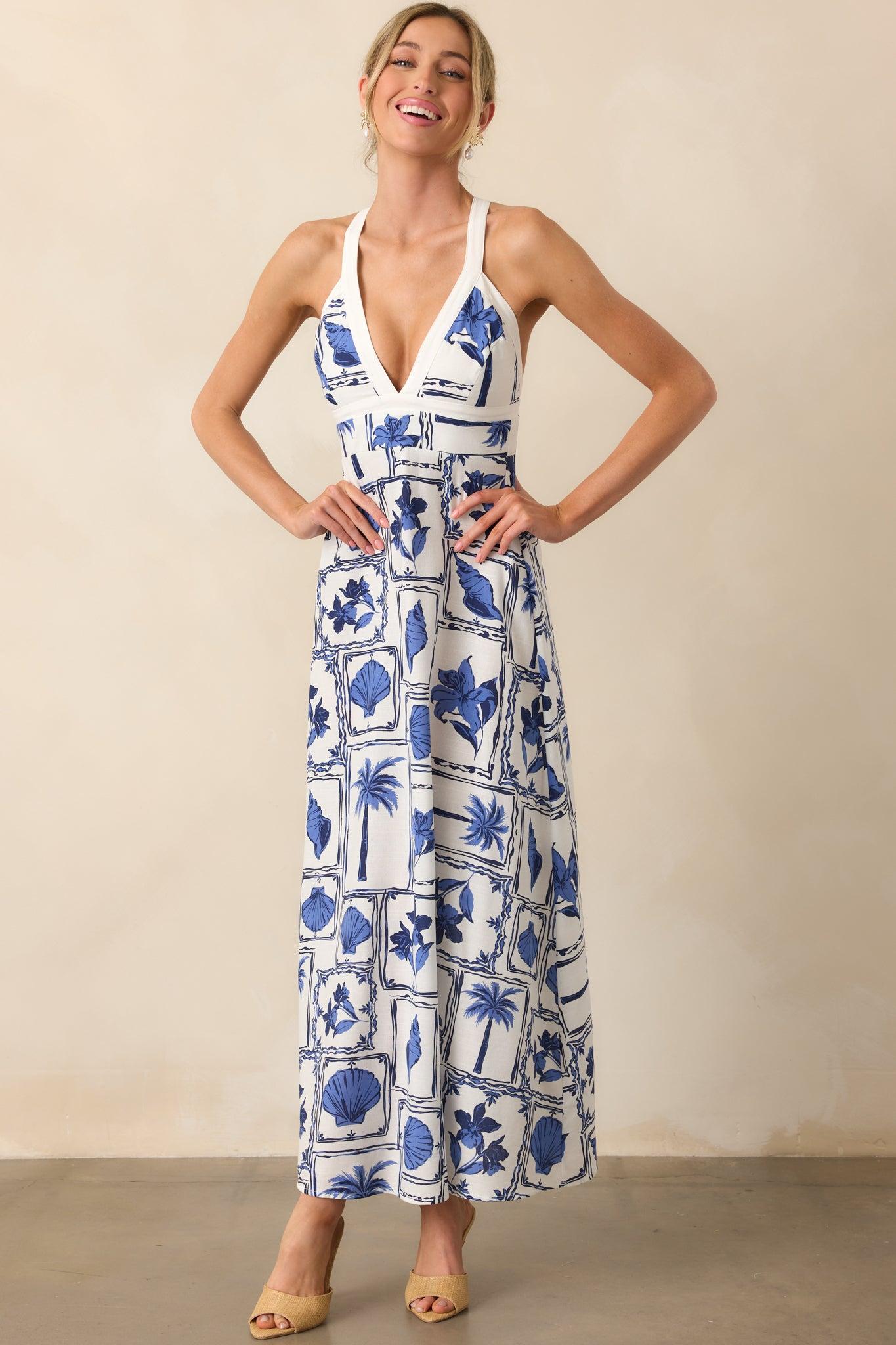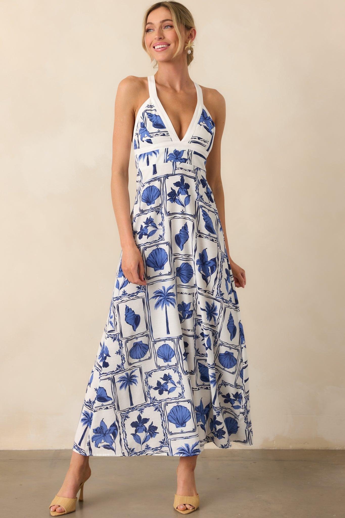 The MINKPINK Blue Patchwork Sylvie Panel Midi Dress combines playful patchwork with a flattering silhouette, making it the perfect piece for a day out or a casual evening. Its unique design effortlessly captures laid-back yet chic vibes. This dress features a blue patchwork beach motif print, v-neckline, wide adjustable straps, cross back design, and a hidden back zipper. 55% Cotton & 45% Viscose Lined: 100% Cotton Hand Wash Cold Manufactured in China Designed in Australia Model is 5'8" and is wearing an x-small