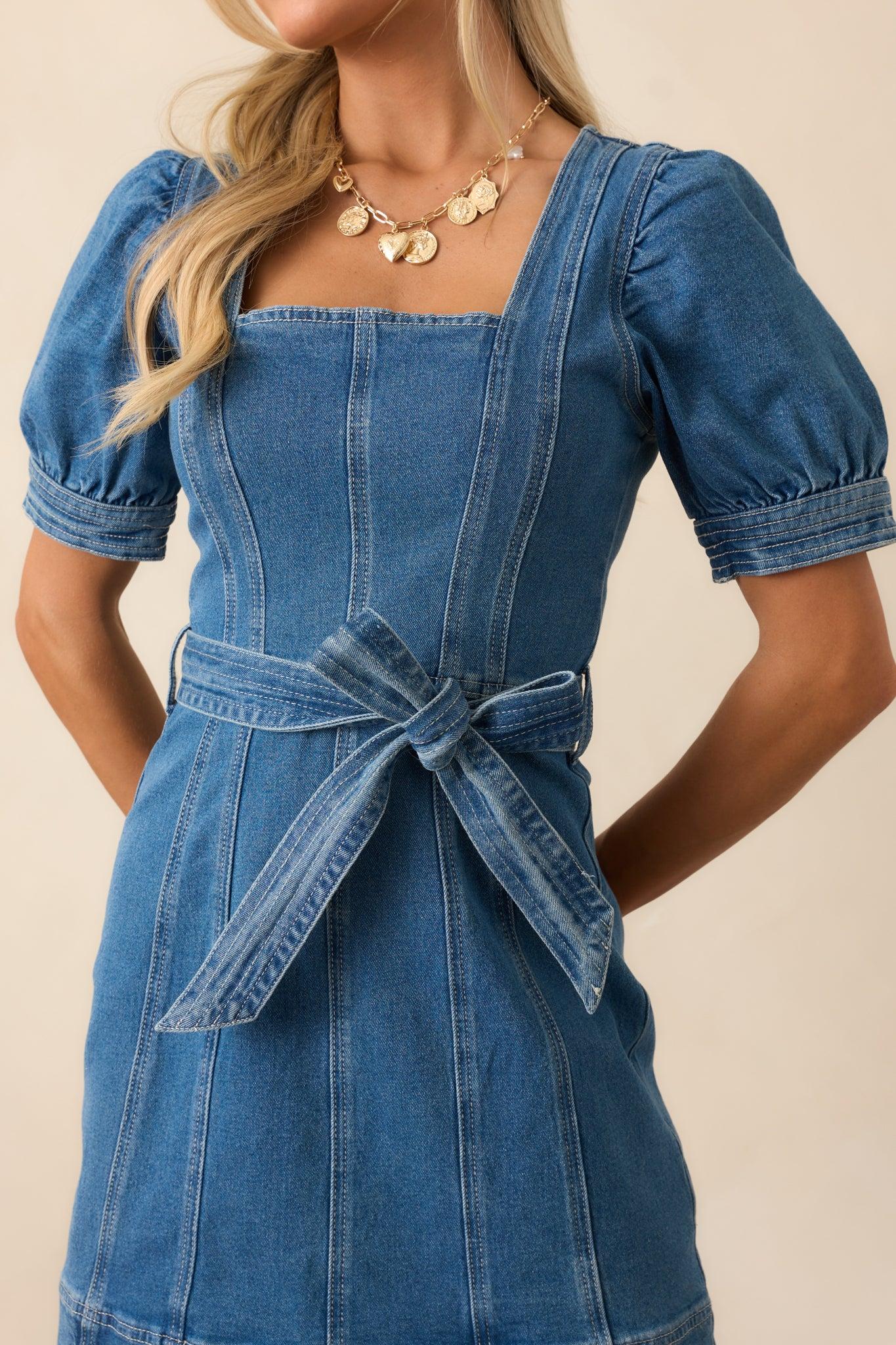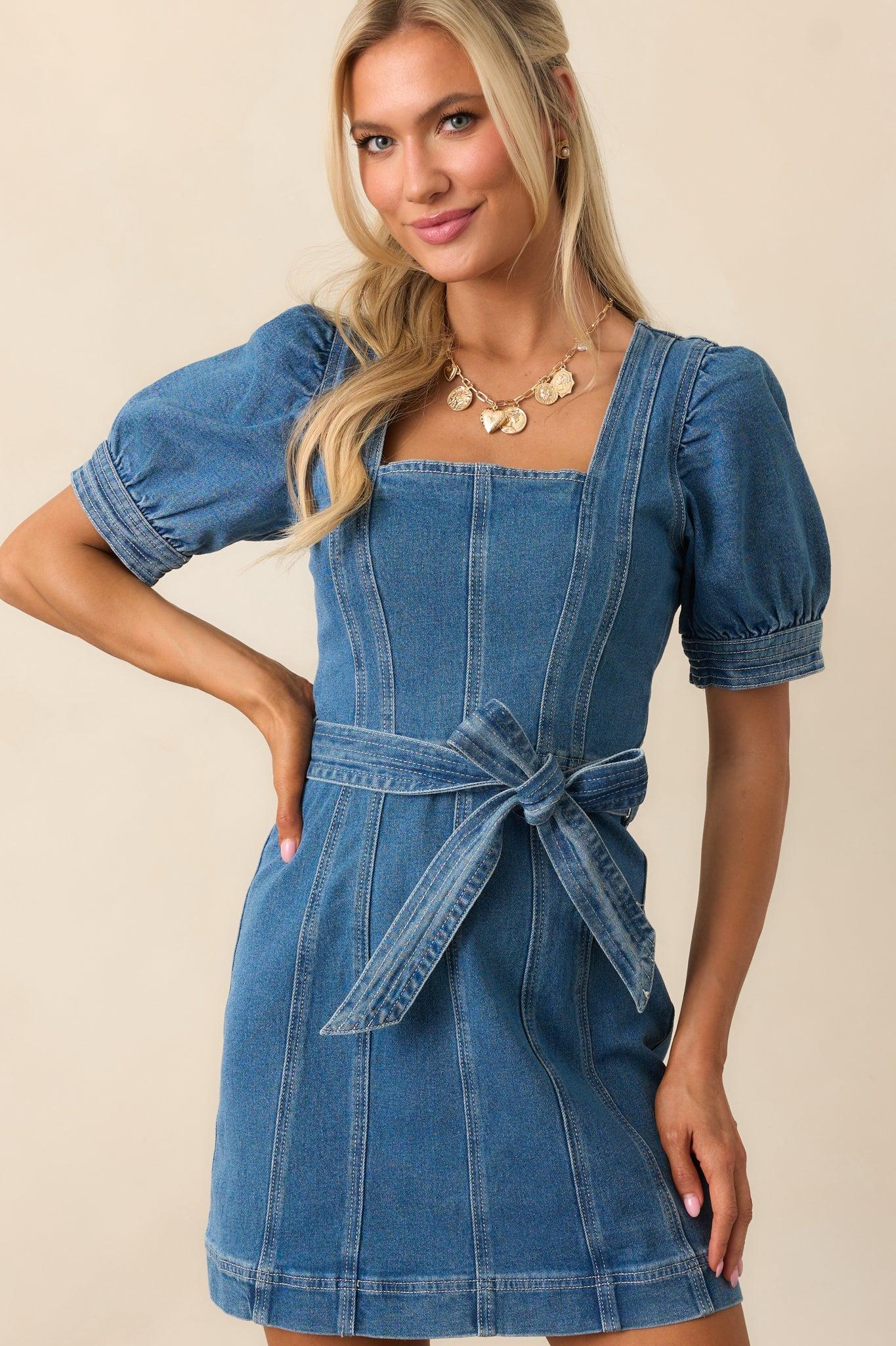Step up your denim style with the MINKPINK Ellis Denim Panel Mini Dress. This chic and contemporary piece features a flattering silhouette crafted from stylish denim panels. A modern twist on a timeless classic, this mini dress is perfect for adding an effortless edge to your wardrobe. This denim mini dress features a panel design, an optional self-tie belt, a gold back zipper, short puff sleeves, and a square necklace.