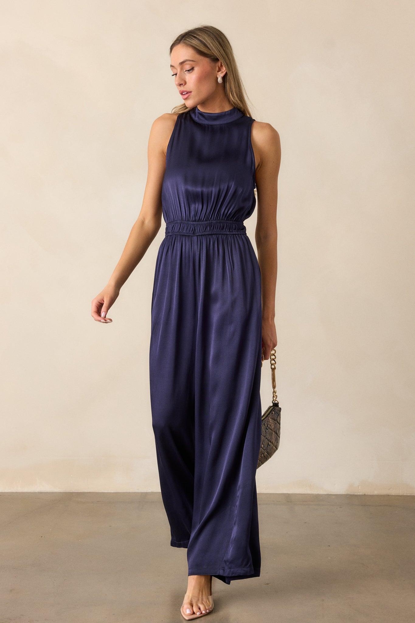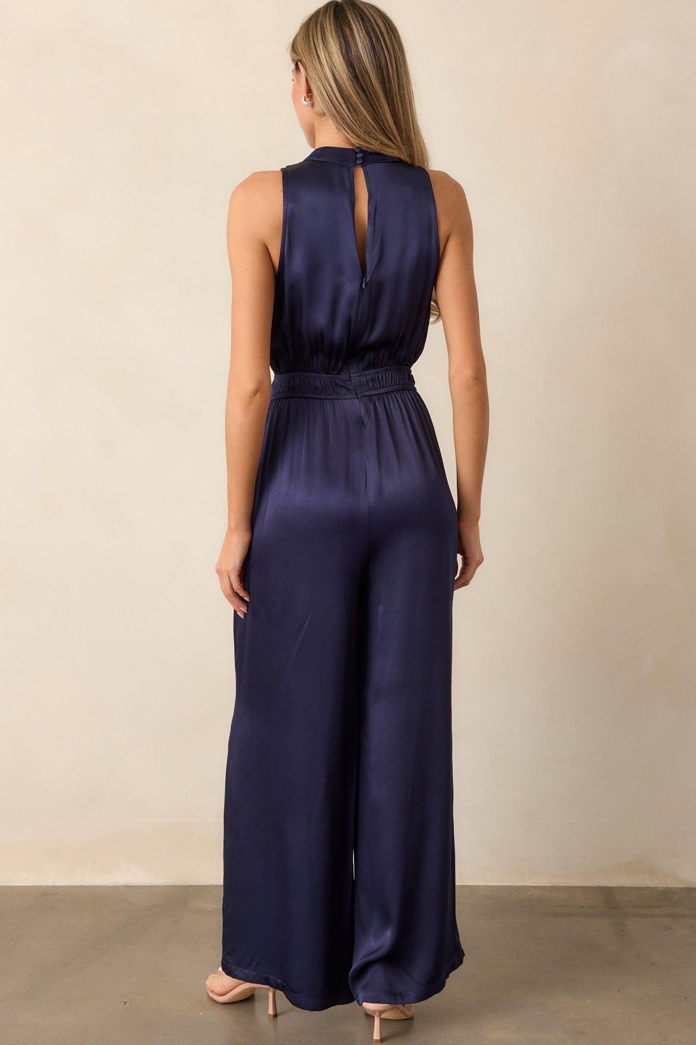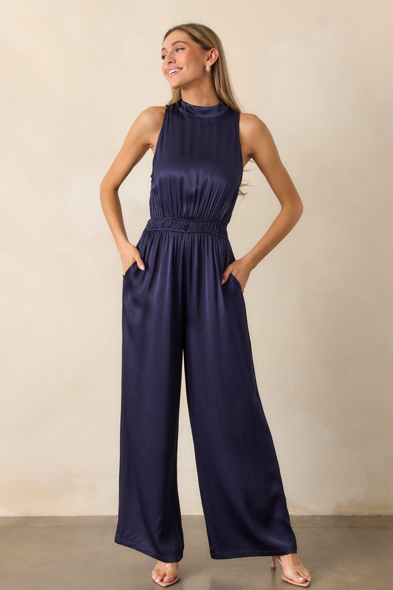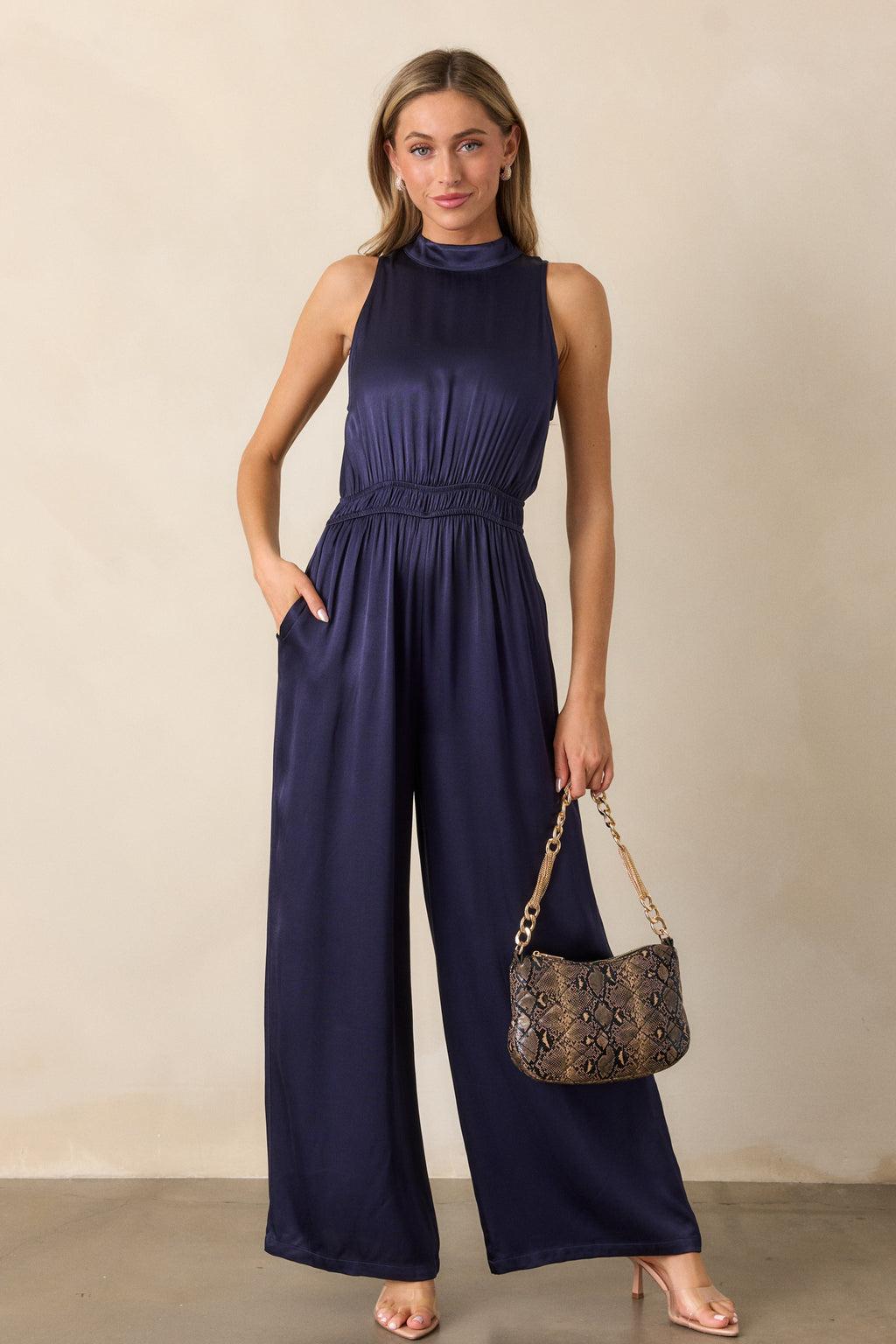 Upgrade your style with our MINKPINK Lumina Midnight Blue High Neck Jumpsuit! Made from high-quality fabric, this jumpsuit offers a sleek and sophisticated look. The high neck design adds a touch of elegance, while the beautiful midnight blue color is perfect for any occasion. Stand out from the crowd and feel confident in this stylish jumpsuit! This midnight blue jumpsuit features a high neckline with button neck clasp, cinch waist elastic detailing, long flowy pant legs and a discrete back zipper.
