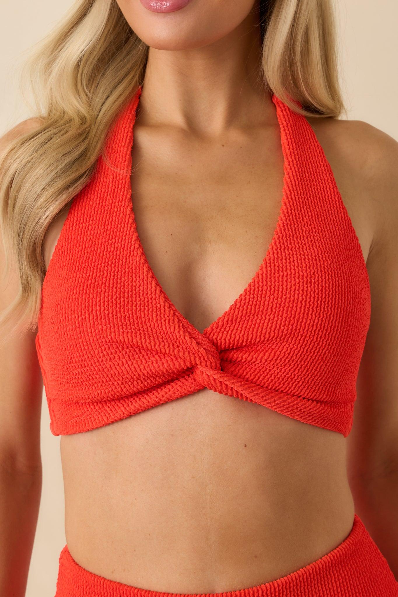 Turn heads from sunrise to poolside in the MINKPINK Scarlett Flame Red Twist Front Halter Bikini Top. Its vibrant flame-red hue and textured stretch fabric sculpt and support in all the right places, while the twist-front detail adds a subtly playful touch. Tie it up, soak up the sun, and enjoy a swim look that knows how to stand out. This red halter bikini top features a textured stretch fabric with a twist-front design, adjustable neck and back ties, a deep V-neckline, and a supportive elastic underbust. Fully lined. 92% Polyester & 8% Elastane Lining: 90% Polyamide & 10% Elastane Hand Wash Cold Manufactured in China Designed in Australia Model is 5'8" and Wearing a Size X-Small
