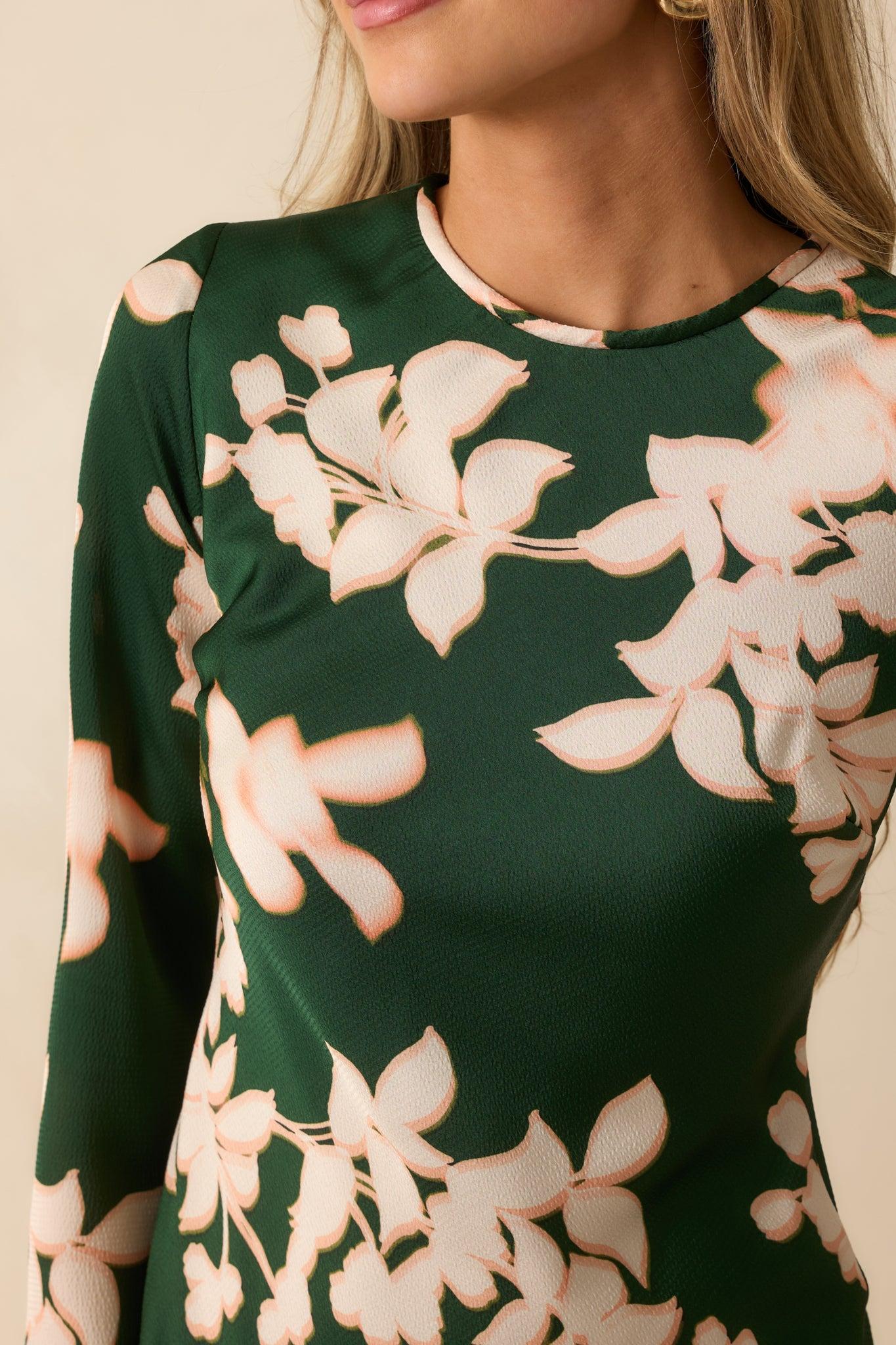 The MINKPINK Vilma Green Floral Print Satin Mini Dress is where effortless charm meets elevated shine. Its green satin drapes with a soft sheen, while the oversized floral print adds a dreamy, romantic touch. Finished with long, fluid sleeves and an easy A-line silhouette, this mini moves seamlessly from day dates to evening cocktails—no styling stress required. This green floral satin mini dress features a hammered satin finish with a subtle sheen and a classic A-line silhouette. It is made with long sleeves, a mini-length hem, and a fully lined interior for comfort and ease from day to night. 100% Polyester Lining: 100% Viscose Hand Wash Cold Manufactured in China Designed in Australia Model is 5'8" and Wearing a Size X-Small