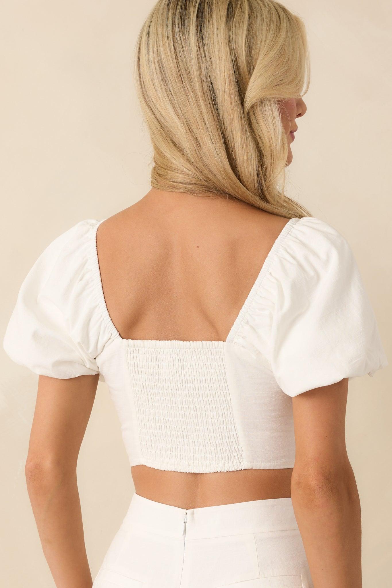 The MINKPINK White Cotton Sonnet Embroidered Top is perfect for styled-up weekends, laid-back dinners, or rooftop evenings. With its feminine details and modern cut, it brings a playful edge to your warm-weather wardrobe. This white top features a square neckline, elastic shoulder inserts, short puff sleeves, elastic cuffs, smocked back panel, cropped length, a hidden side zipper, and blue floral embroidered detailing. 65% Cotton, 30% Viscose & 5% Linen Lined: 100% Viscose Machine Wash Cold Manufactured in China Designed in Australia Model is Wearing a Size X-Small