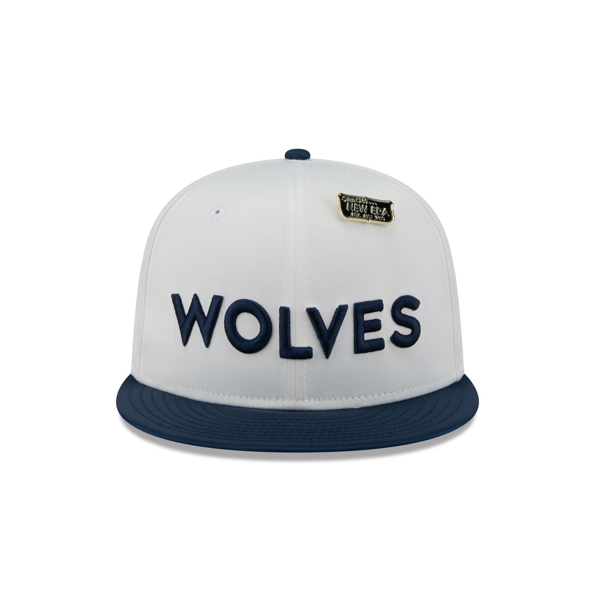 The Minnesota Timberwolves Spring Satin 59FIFTY Fitted Cap features an embroidered Timberwolves wordmark at the front panels with a New Era pin at the top left panel and an NBA Logoman at the rear. Additional details include a satin fabrication throughout, a logo at the right-wear side, and a green undervisor.