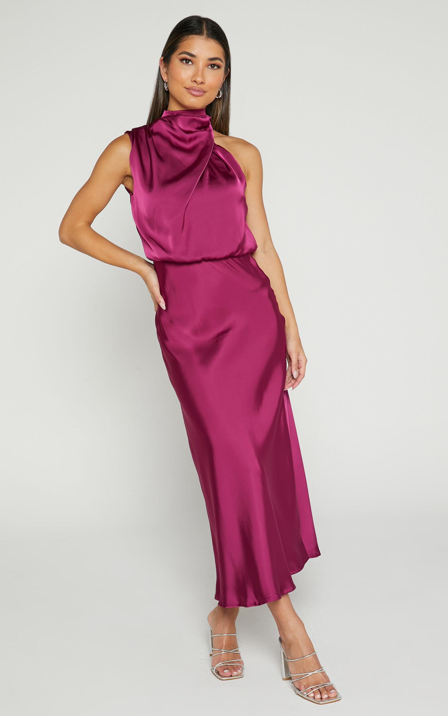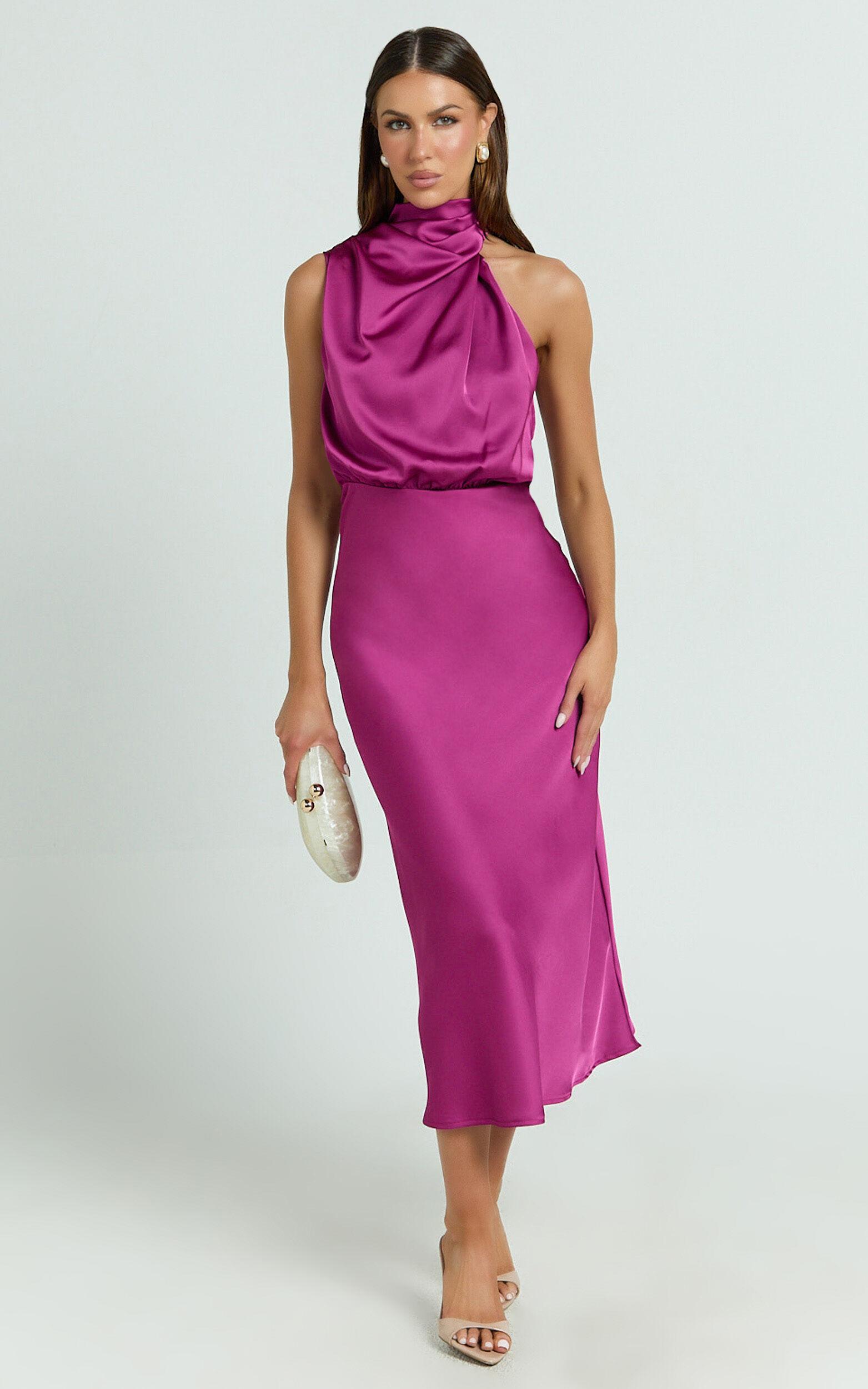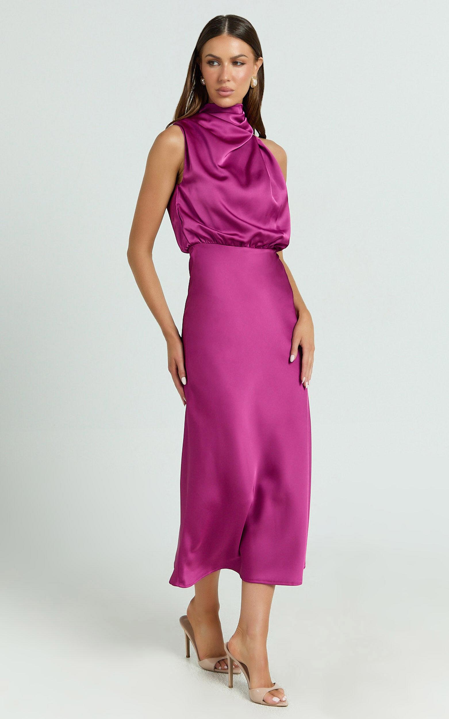 Effortlessly elegant, the Minnie Midi Dress is a luxurious addition to your wardrobe. The drape neck design creates a flattering silhouette that skims over your curves in all the right places, while the smooth satin fabric adds a touch of glamour. This gorgeous purple slip dress is perfect for any occasion - from cocktail parties to weddings and even as bridesmaids dresses.So whether you're attending as a wedding guest or taking center stage as part of the bridal party, this dress will have you feeling confident and beautiful. Upgrade your style with Showpo's Minnie Midi Dress today!