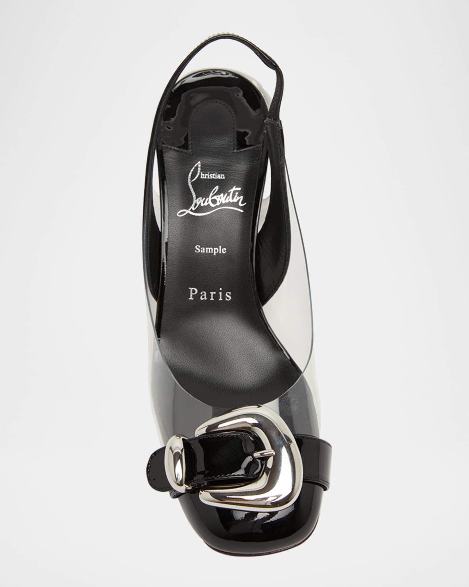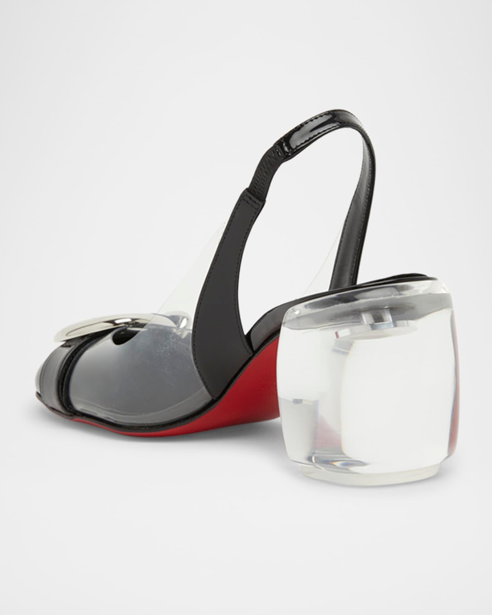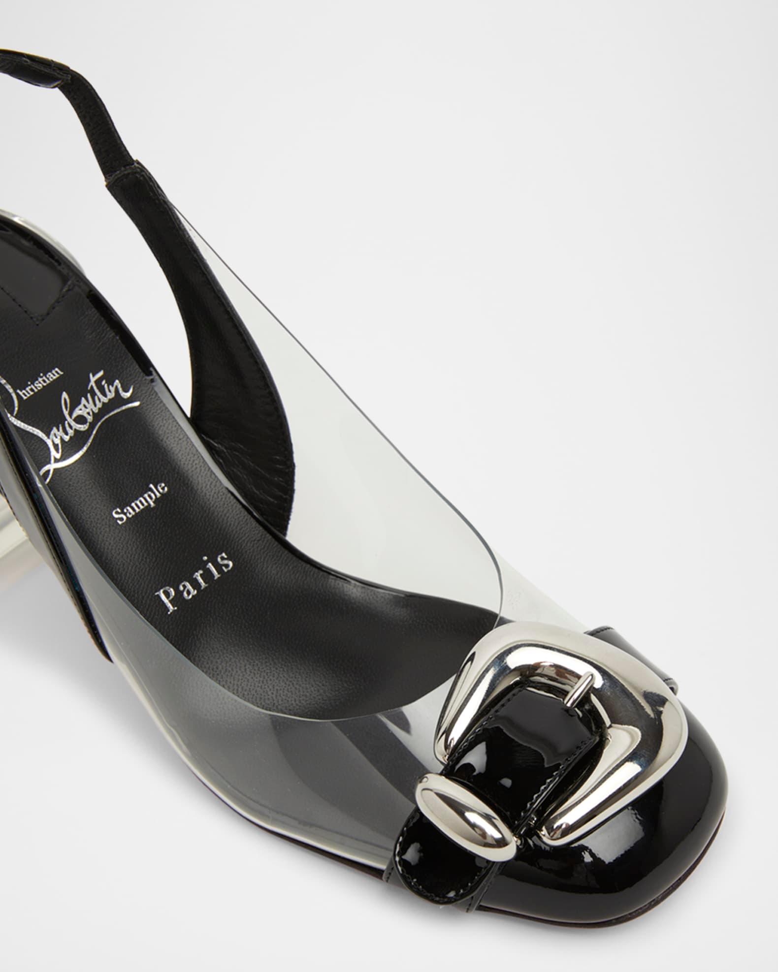 Christian Louboutin "Minny Bubble" clear PVC, polyurethane, and patent leather pumps featuring a buckle strap accent 2.75 in / 70 mm transparent block heel Round cap toe Stretch slingback strap Signature red leather/Rubber outsole Made in Italy
